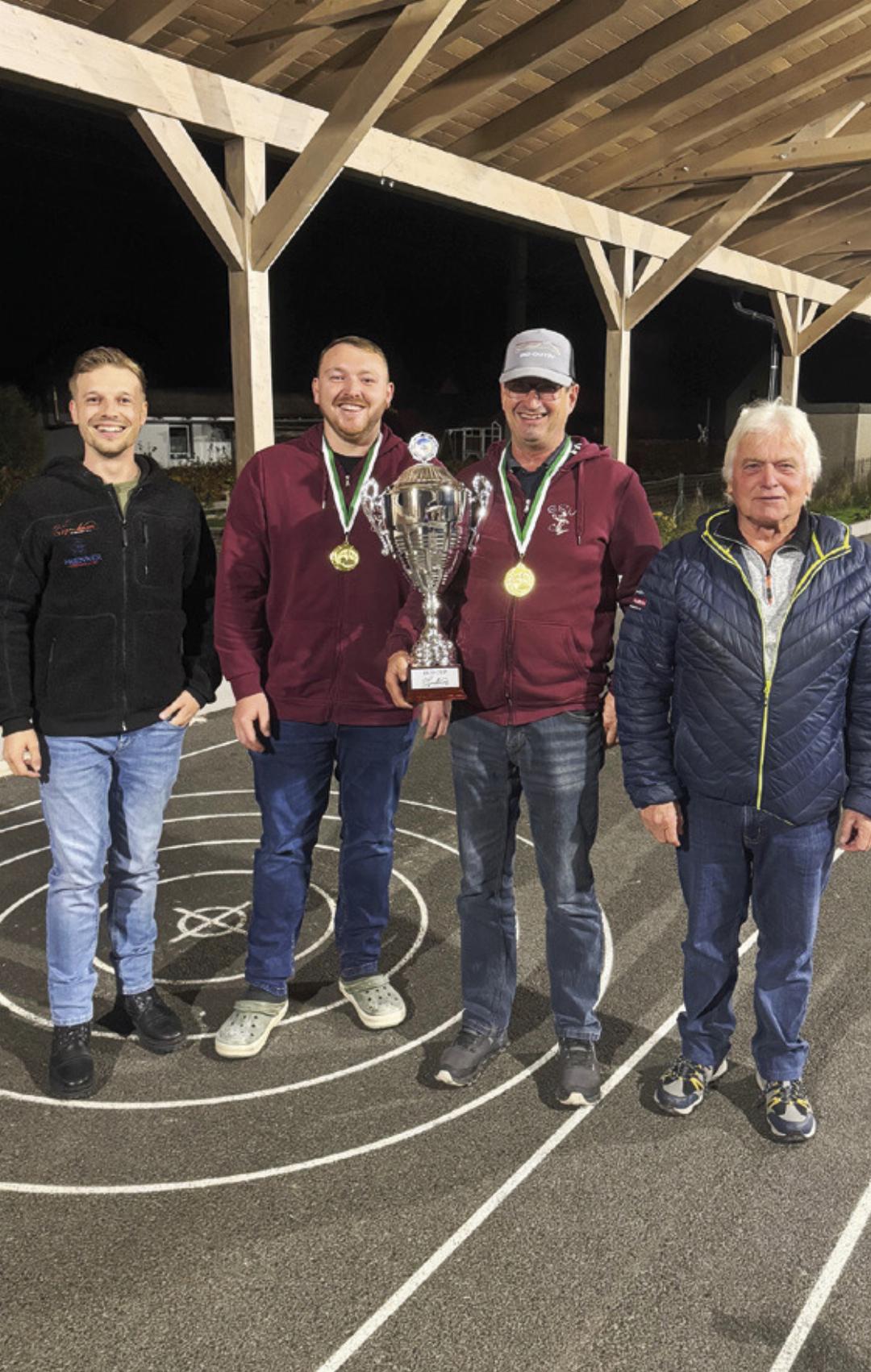 Am 25. Oktober wurde auf der Asphalt-Stockbahn in Öblarn erstmals das Duo-Cup-Schießen ausgetragen. In spannenden Duellen lieferten sich die Teilnehmer packende Wettkämpfe. Den Sieg holten sich Dominik Hirz und Franz Egger, die sich im Finale gegen starke Konkurrenz durchsetzen konnten. Heinz Lautner und Gerhard Landsfried belegten den zweiten Platz, gefolgt von Guido Karlsberger und Jürgen Perner. Am Foto: Gemeindekassier Roland Nerwein, Sieger Dominik Hirz und Franz Egger mit Obmann Helmut Stauchner.