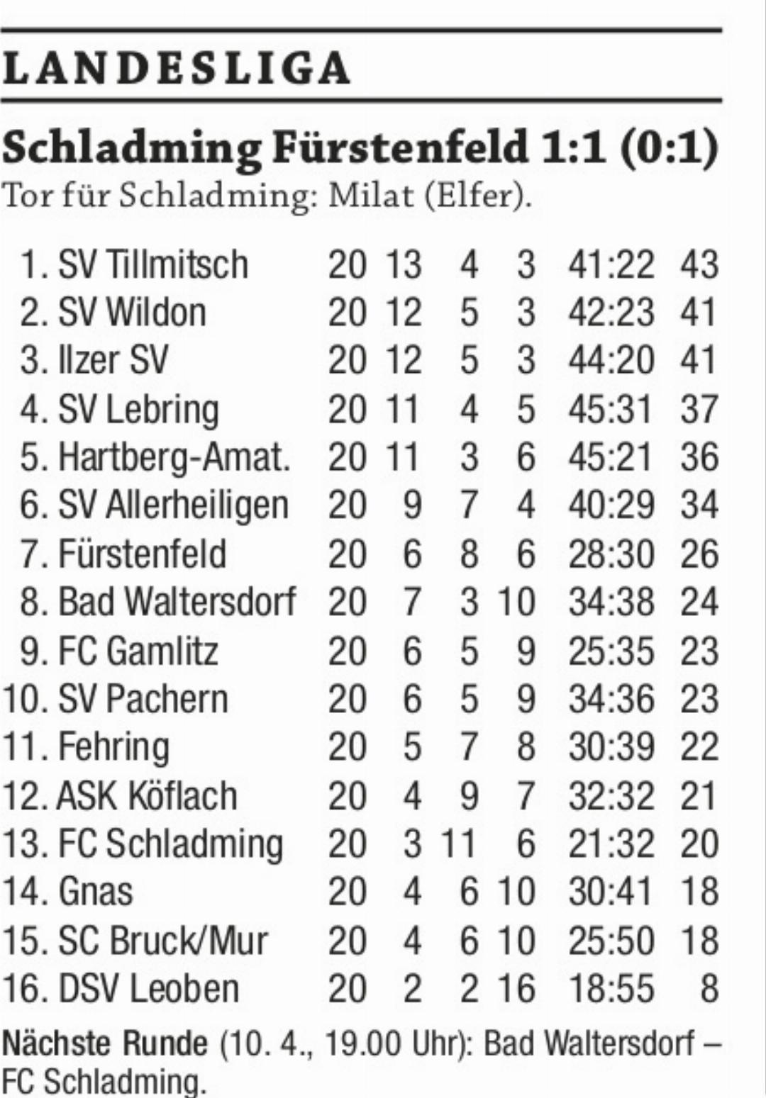 Mit dem 1:1-Heimunentschieden gegen Fürstenfeld blieb der FC Schladming zum vierten Mal in Folge ungeschlagen. Für die stark ersatzgeschwächt in die Partie gegangenen WM-Städter kann man die zehnte Punkteteilung gegen die noch ungeschlagene beste Frühjahrsmannschaft als Erfolg bezeichnen. Die Oststeirer gingen in der 33. Minute in Führung. Zehn Minuten vor dem Schlusspfiff wurde der eingewechselte Kilian Danklmayer im Strafraum unsanft von den Beinen geholt und den dafür verhängten Elfmeter verwertete Toni Milat zum 1:1-Ausgleich. Bitter war am Ende noch, dass die Hausherren in der Nachspielzeit zum dritten Mal in Folge den Lucky Punch vergaben.
