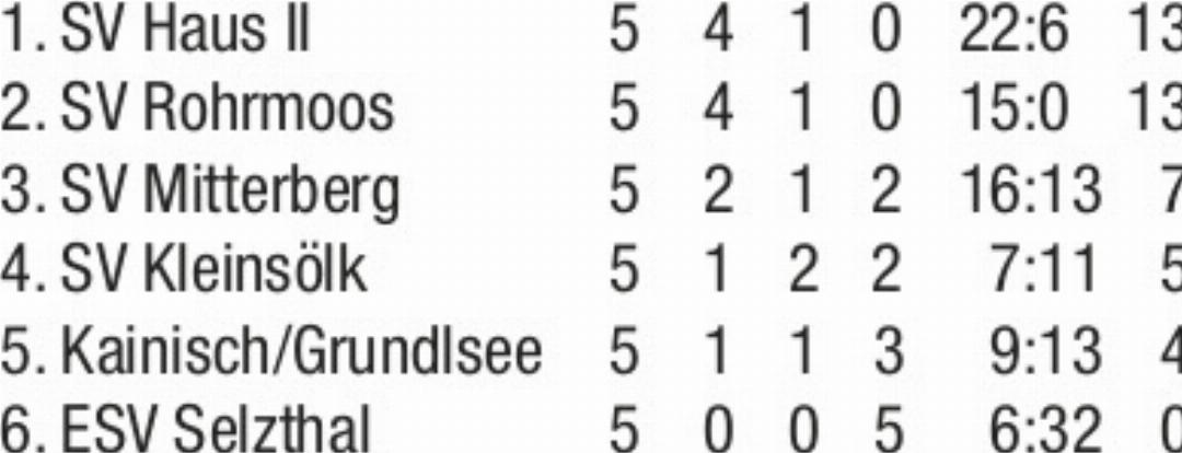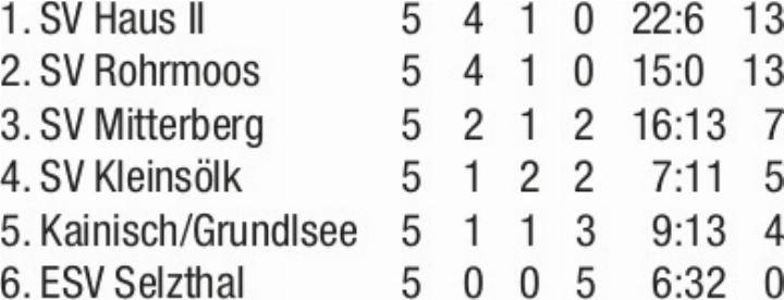 Bei Punktegleichheit mit dem SV Rohrmoos-Untertal, aber dank der besseren Tordifferenz (+1), holte sich der SV Haus II den DFM-Herbstmeistertitel.