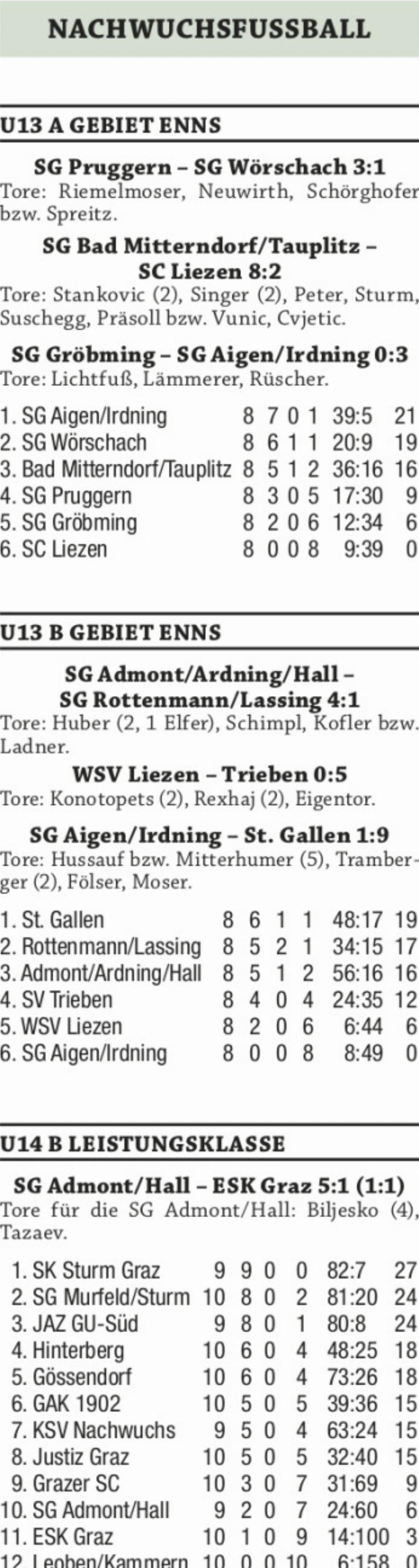 Für die große Überraschung in der U13 A sorgte Pruggern mit dem 3:1-Heimsieg gegen Leader Wörschach. Die SG Aigen/Irdning U13 Blau B nützte den Umfaller der Wörschacher aus und setzte sich mit einem 3:0-Auswärtssieg gegen Gröbming an die Tabellenspitze. Auch in der U13 B gab es einen Führungswechsel. Leader SG Rottenmann/Lassing verlor beim Drittplatzierten SG Admont/Hall klar mit 1:4 und damit lacht St. Gallen dank eines 9:1-Kantersieges bei der SG Aigen/Irdning U13 Gelb A von der Tabellenspitze. Der insgesamt fünffache Torschütze Samuel Mitterhumer erzielte in der Partie zwischen der 54. und 70. Minute einen lupenreinen Hattrick. SV Trieben gewann das Sechspunktespiel um Platz vier in der U13 B gegen WSV Liezen auswärts mit 5:0.