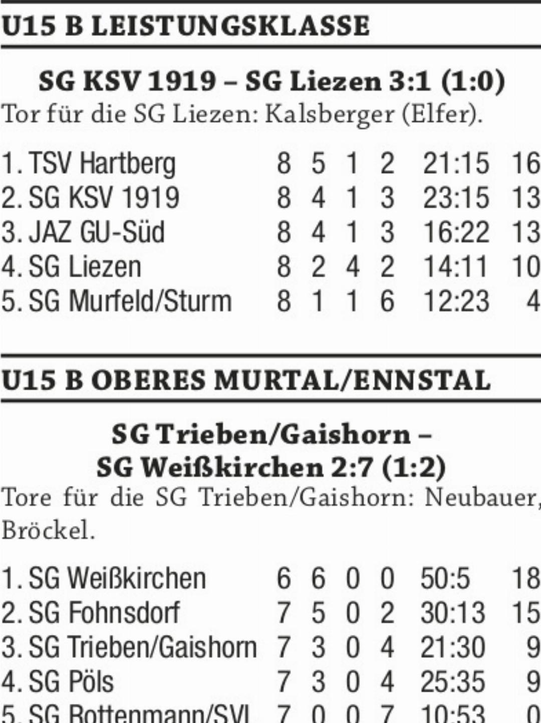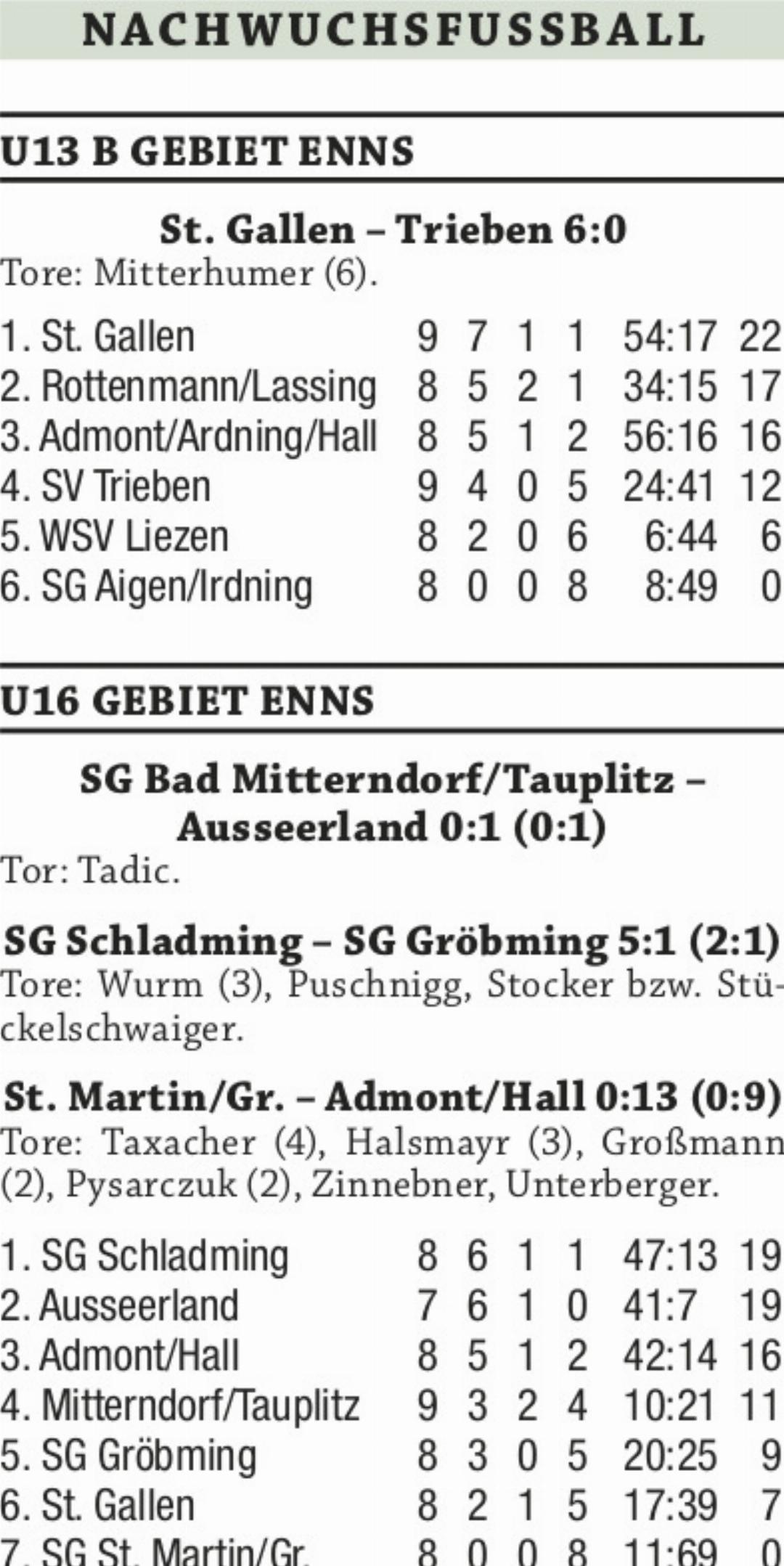 Schwerer als erwartet taten sich in der vorletzten Runde der U13 A die zwei Tabellenersten. Spitzenreiter SG Aigen/Irdning Blau B feierte gegen Schlusslicht SC Liezen einen einen hart erkämpften 2:0-Auswärtssieg und Verfolger Wörschach hatte ebenfalls Mühe, um zu Hause gegen die SG Bad Mitterndorf/Tauplitz mit 2:1 die Oberhand zu behalten. Am kommenden Sonntag um 16 Uhr kommt es im direkten Duell zwischen der SG Aigen/Irdning und Wörschach zum Showdown um den Herbstmeistertitel. Den Hausherren genügt dabei ein Unentschieden zum Titelgewinn. Pruggern setzte sich im Sechspunktespiel gegen Gröbming knapp mit 4:3 durch. In der U13 B machte St. Gallen mit einem überlegenen 6:0-Heimsieg gegen SV Trieben einen großen Schritt in Richtung Winterkönig.