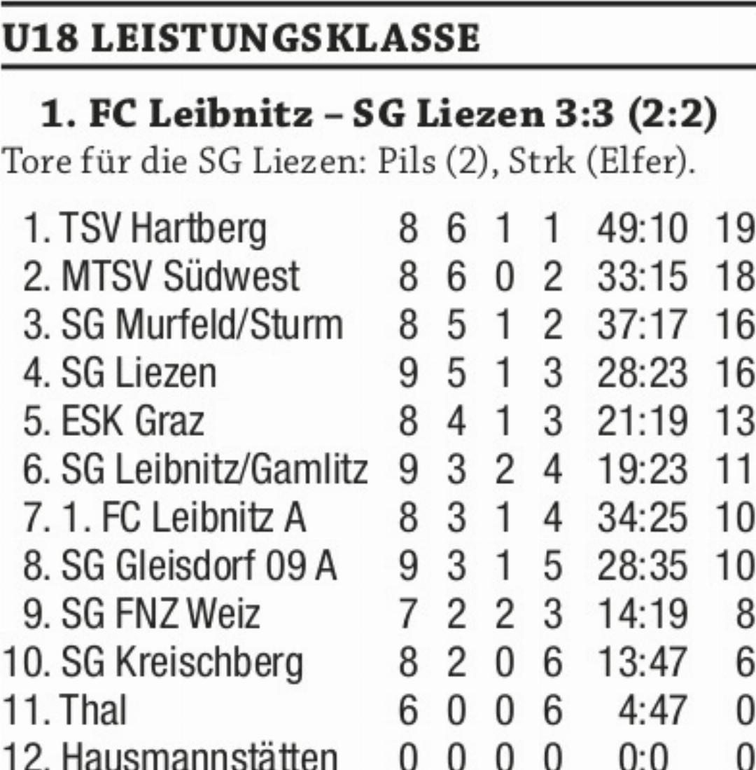 Im letzten Auswärtsspiel der steirischen Leistungsklasse holte die U18 des SC Liezen mit dem 3:3-Unentschieden gegen Leibnitz einen mehr als verdienten Punkt. Die körperlich überlegenen Hausherren begannen druckvoll und gingen in der 10. Minute mit 1:0 in Front. In weiterer Folge ...