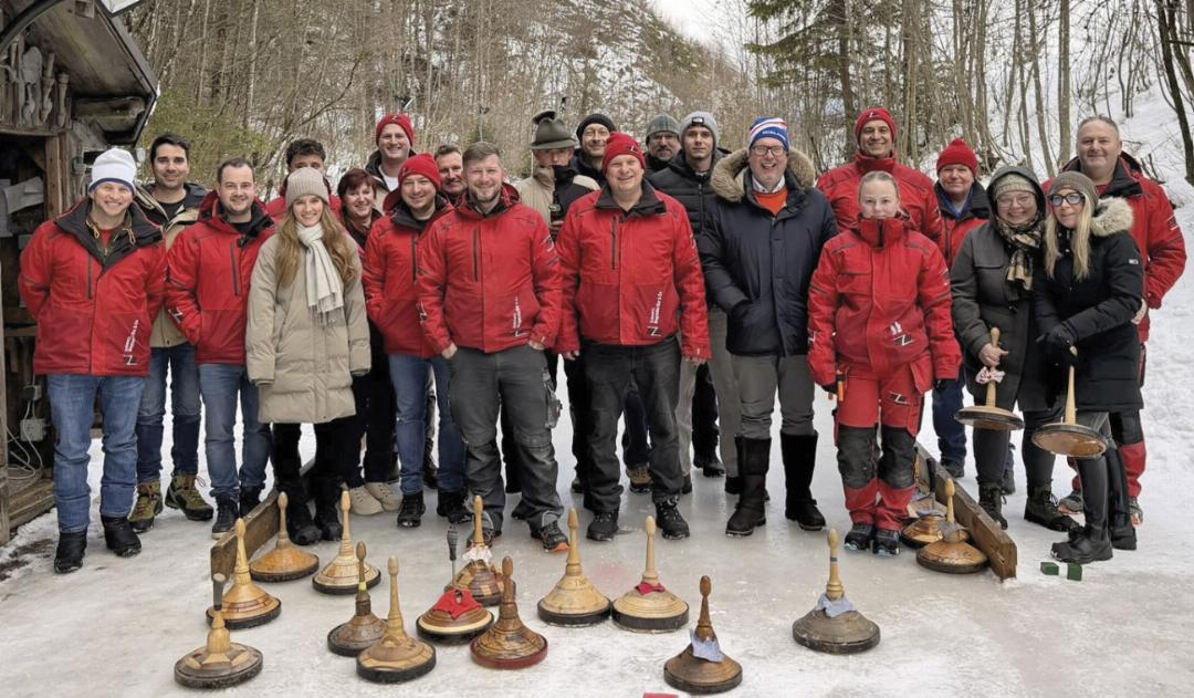 Nachdem das E-Werk Gröbming im letzten Winter das lange Zeit gepflogene firmeninterne Eisschießen des Ausseer E-Werkes Schwarz Wagendorffer & Co wieder aufleben ließ, folgte heuer auf der Feyrer-Eisbahn die Revanche. Die Bedingungen waren derart großartig, dass selbst die diesjährige Eisglatze beim Nachtslalom in Schladming das Nachsehen gehabt hätte. Der Netztrupp wurde von Moar Stefan Temel kommandiert (Noh-Moar, also ennstalerisch „Hagl“, war Thomas Simentschitsch), als Moar der Installationsabteilung fungierte Schwarz-Wagendorffer-GF Ernst Trummer mit Noh-Moar Roman Moser an seiner Seite. Das Bratl ging kurz und schmerzlos nach zwei gewonnen Kehren an die Installationsabteilung. Beim Getränk gingen wie von Geisterhand plötzlich Messglück und Spielglück verloren und der Netztrupp hatte die Oberhand.