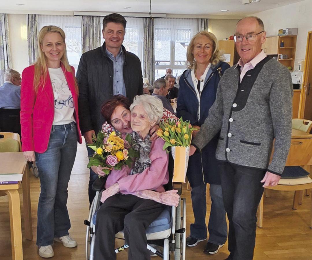 Greti Schlagenhaufen feierte kürzlich ihren 100. Geburtstag gemeinsam mit ihrer Familie im Pflegeheim Unterburg. 1926 in Gröbming geboren, in Liezen aufgewachsen, lebte die Mutter mit ihren Kindern und ihrem Mann am Fuße des Grimmings in Unterburg. Erst vor rund 15 Jahren, mit 85 Jahren, erlebte sie ihre ersten Urlaube in Italien und der Südsteiermark. Damals wie heute singt sie für ihr Leben gern und bereichert so manche Zusammenkunft und Feierlichkeit im Haus. Am Foto: Hausleiterin Tanja Klingler-Selinger, Bgm. Roland Ranninger, Pflegedienstleiterin Regina Winkler-Renner, Jubilarin Margarethe Schlagenhaufen, Brigitte Weihnacht und Johann Schachner (Pfarrgemeinderäte der Pfarre Pürgg).