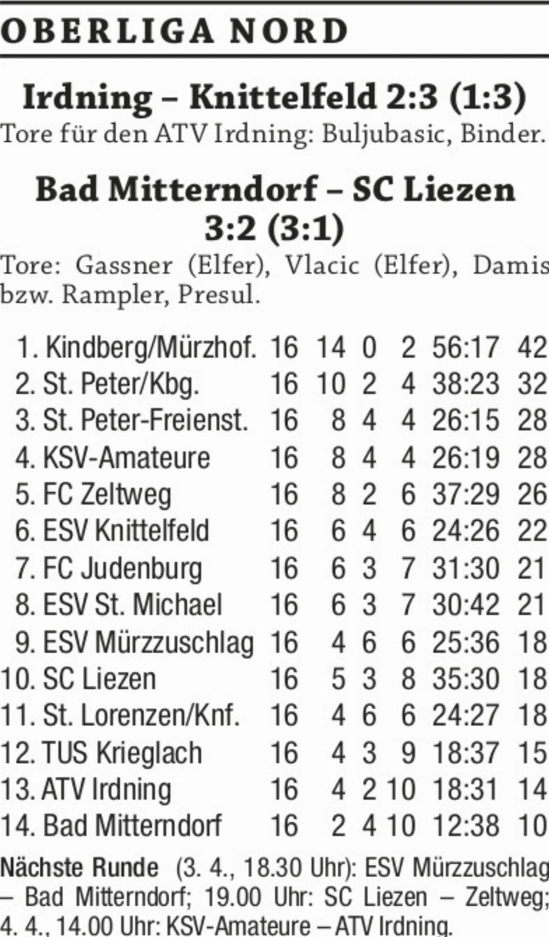 ATV Irdning musste sich mit der 2:3-Heimniederlage gegen ESV Knittelfeld zum dritten Mal in Folge mit einem Tor Unterschied geschlagen geben. In der ersten Halbzeit waren die Murtaler über weite Strecken die spielbestimmende Mannschaft. Senad Buljubasic egalisierte in der 13. Minute zwar die schnelle 0:1-Führung der Gäste, doch durch zwei Tore in der 26. und 45. Minute gingen die Gäste mit einem 1:3-Vorsprung in die Pause. Michael Binder verkürzte in der 53. Minute mit seinem ersten Oberligator auf 2:3. Im weiteren Verlauf fanden die Irdninger zahlreiche dicke Chancen vor, wobei Manuel Ladreiter in der Schlussminute am leeren Tor vorbeischoss. Irdnings Sportchef Willi Danklmaier sagte zur dritten Niederlage in Folge: „Die erste Halbzeit haben wir verschlafen und auch dumme Tore bekommen. Die zweite Spielhälfte war dann sehr gut, letztendlich hätten wir uns ein Unentschieden verdient.“