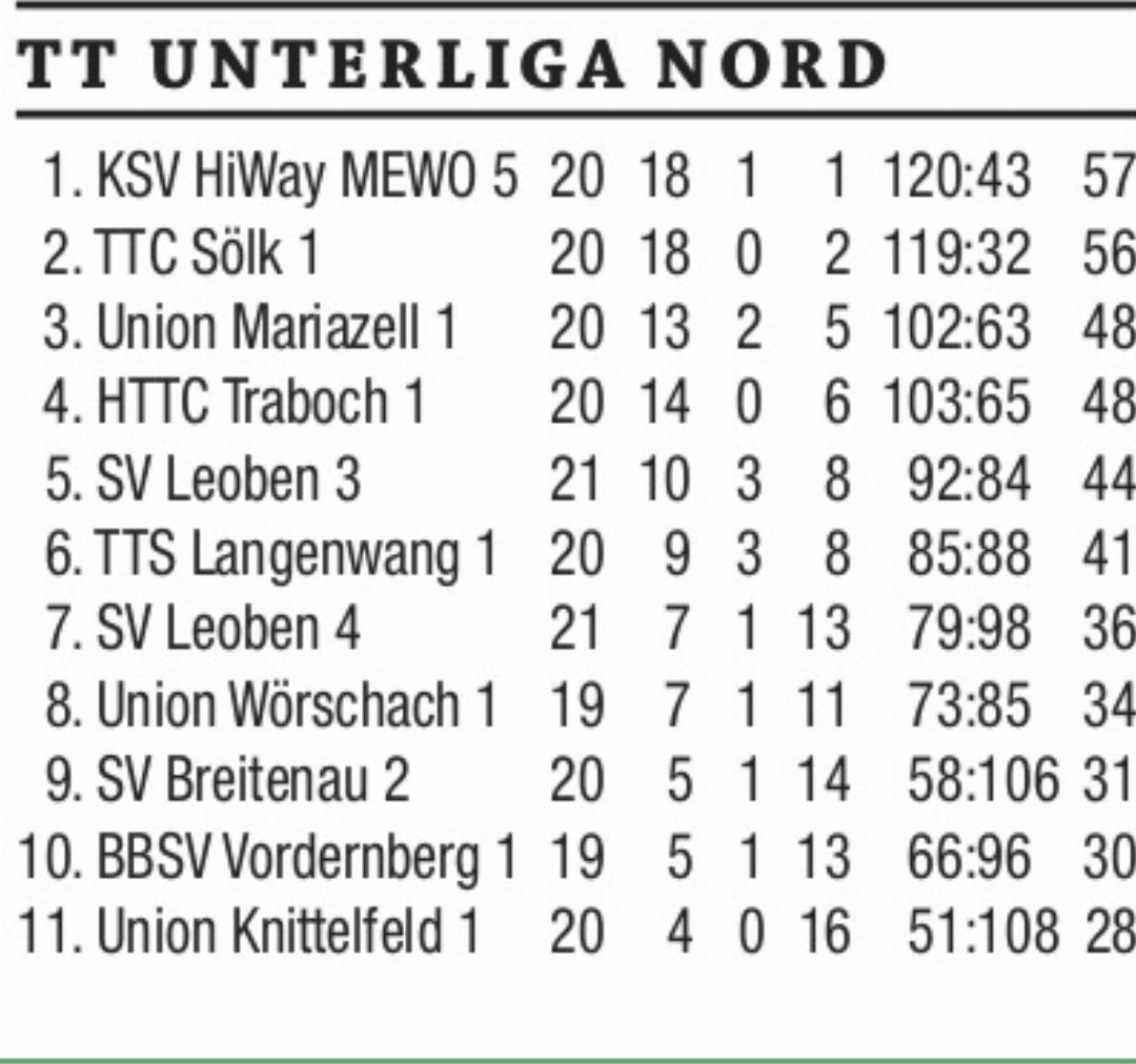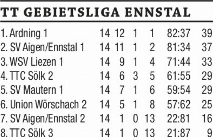 Zwei klare Erfolge für TTC Sölk in der Unterliga Nord. Knappe Niederlage für Union Wörschach. SV Aigen beendete Saison in der Gebietsliga Ennstal mit einem Sieg.