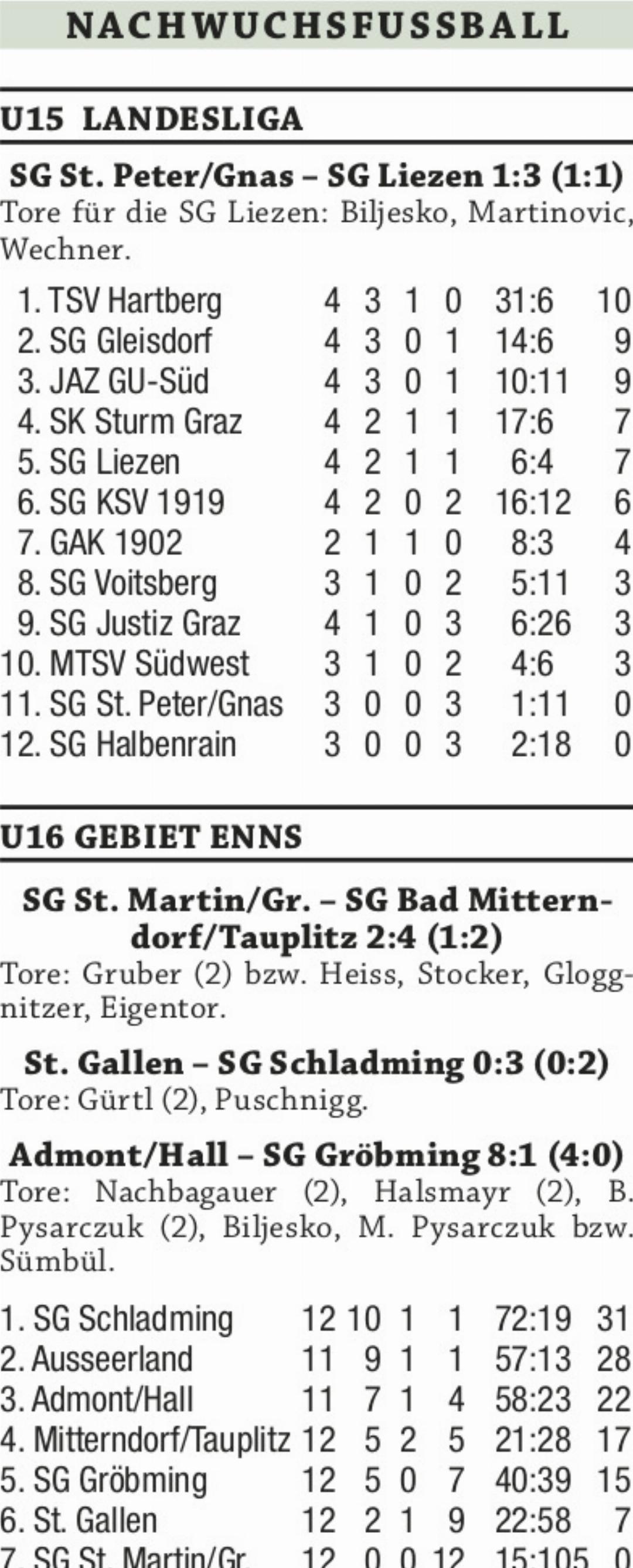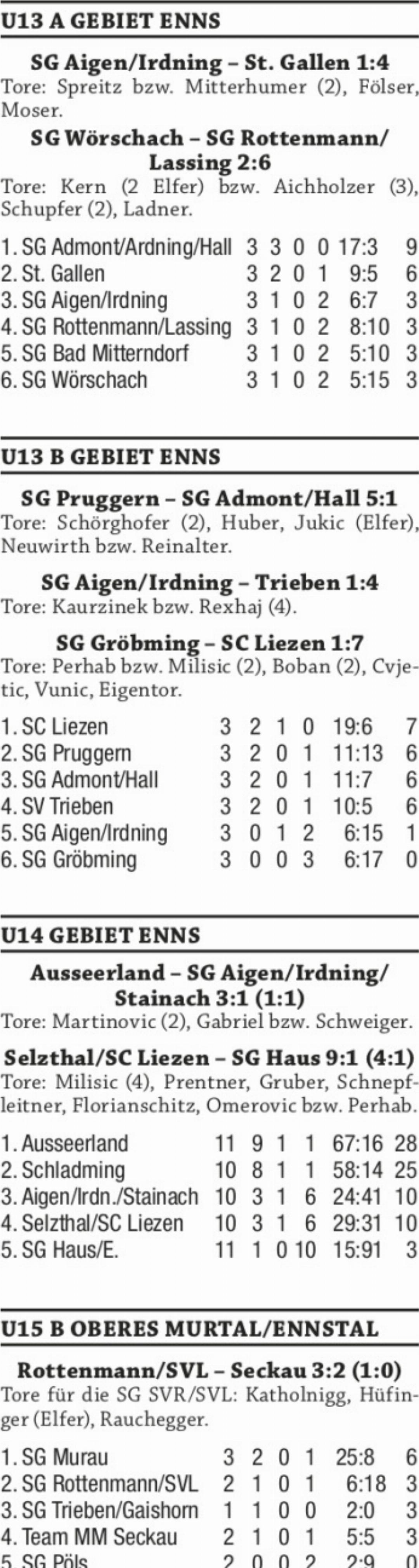 In der U16-Regionalklasse hat Leader FC Schladming nach dem 3:0-Auswärtssieg gegen St. Gallen drei Punkte Vorsprung auf den spielfreien Verfolger FC Ausseerland. Durch zwei Tore von Roman Gürtl und einen Treffer durch Michael Puschnigg war das Match bereits nach einer Stunde entschieden. Die U15 des SV Rottenmann rehabilitierte sich mit einem 3:2-Heimsieg gegen Team MM Seckau für das Debakel gegen Pöls im Auftaktspiel. In der U14 übernahm FC Ausseerland mit einem 3:1-Heimerfolg gegen die SG Aigen/Irdning/Stainach die Tabellenführung von der spielfreien Schladminger Nachwuchsmannschaft. Nach einem 1:1-Pausenstand sorgten der zweifache Torschütze Gabriel Martinovic und Maxim Gabriel für den achten Saisonsieg der Ausseer Jungkicker.