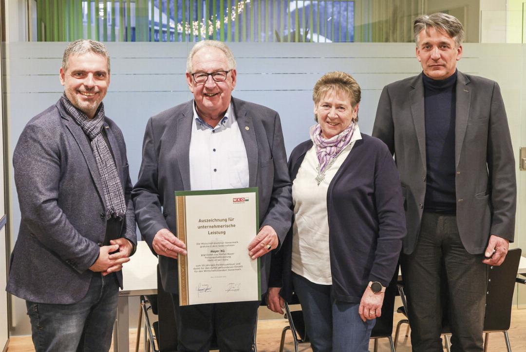 Die Mayer KG in Stein an der Enns feiert ihr 50-jähriges Bestehen. Seit der Gründung steht das Familienunternehmen für Verlässlichkeit, Qualität und regionale Verbundenheit im Personenbeförderungsgewerbe. Im Rahmen eines feierlichen Besuchs würdigte Christian Hollinger, Regionalstellenleiter Ennstal/Salzkammergut, die langjährige unternehmerische Leistung des Betriebes. Gemeinsam mit Werner Schwab, Bürgermeister der Gemeinde Sölk, überreichte er die Ehrenurkunde an Stefan und Veronika Mayer. Seit 2015 wird das Unternehmen von seinem Sohn Roland Mayer in zweiter Generation weitergeführt.