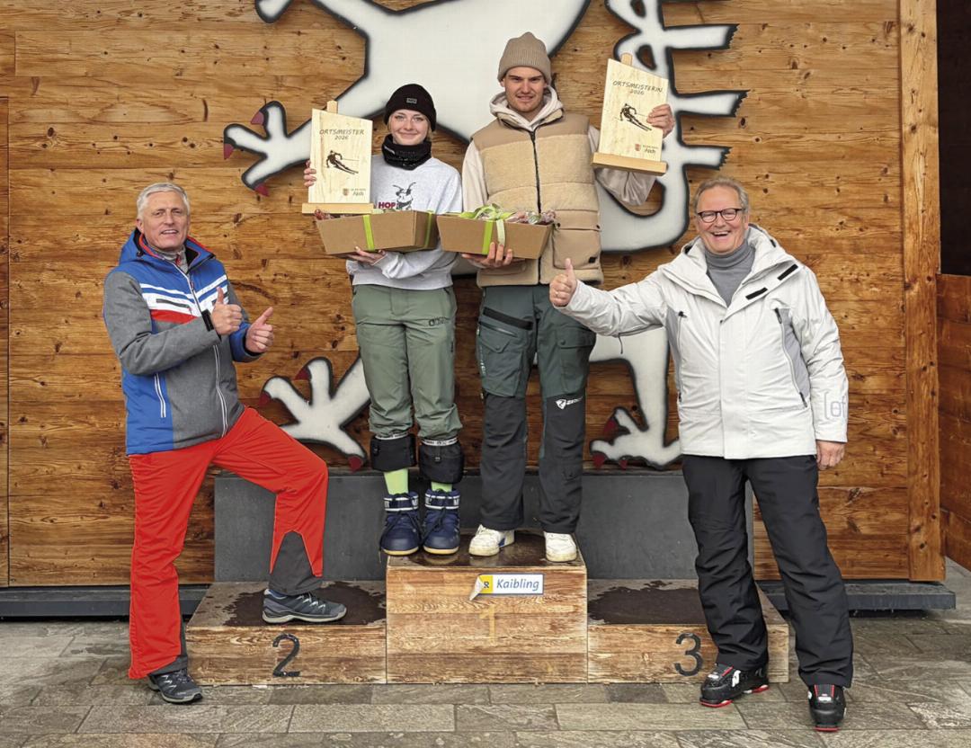 Vergangenes Wochenende fanden in der Gemeinde Aich die 26. Ortsmeisterschaften am Hauser Kaibling statt. Insgesamt standen 148 Rennläuferinnen und -läufer am Start, was einen neuen Rekord bedeutete. Für die Durchführung zeichnete sich der SV Union Haus/Ennstal verantwortlich. Die begehrten Titel konnten sich Yasmine Roiderer und Simon Danklmaier sichern. Am Foto: Bgm. Franz Danklmaier (re.) und Vzbgm. Thomas Puschnigg (li.) gratulierten den Ortsmeistern.
