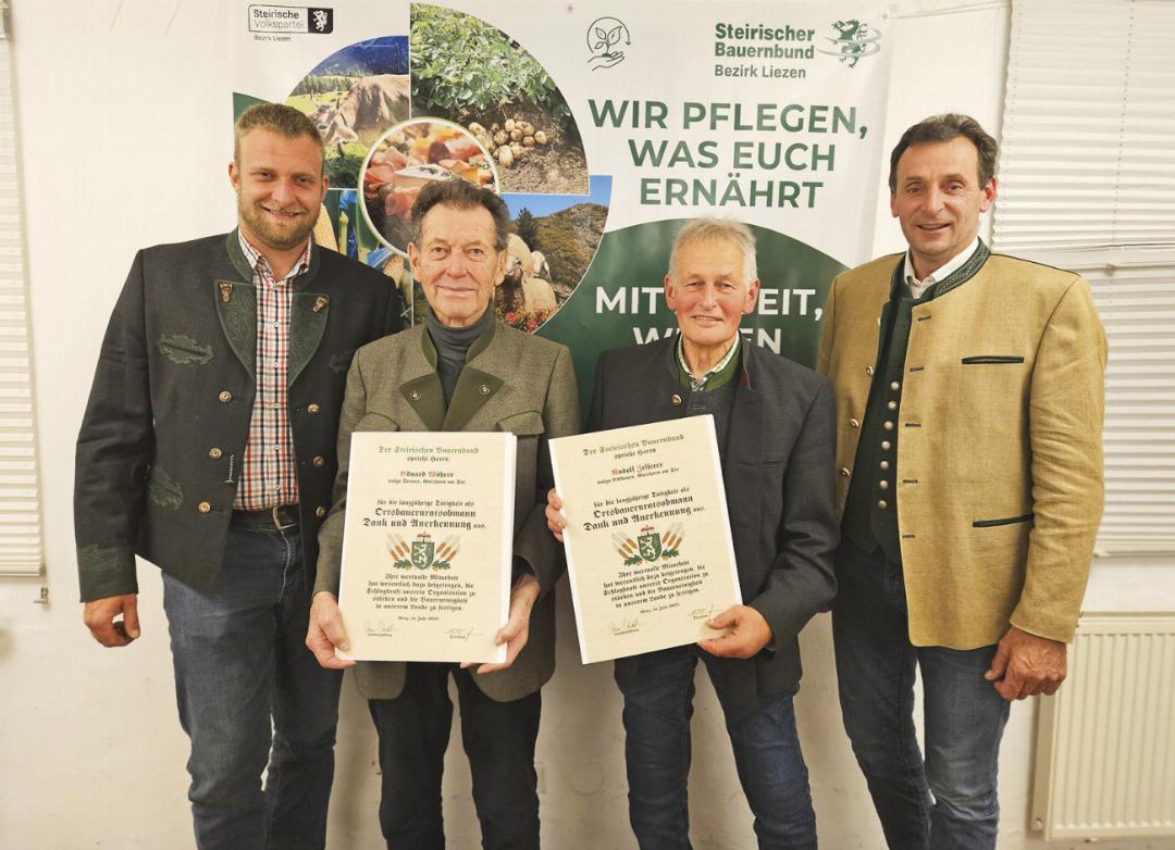 Eine neue Ära für den Bauernbund in Gaishorn: Die Bauernbund-Ortsgruppen Gaishorn und Treglwang hielten kürzlich eine gemeinsame Generalversammlung ab, bei der die Mitglieder einstimmig die Vereinigung der beiden Ortsgruppen beschlossen. Die Obmänner, Eduard Wöhrer und Rudolf Zefferer gingen in ihren Berichten auf die Arbeit der Ortsgruppen in der Gemeinde, aber auch auf die Herausforderungen der Bauernschaft ein. Über 30 Jahre führte Rudolf Zefferer den Bauernbund von Treglwang mit Geschick und ruhiger Hand. Zu toppen schaffte es Eduard Wöhrer, der insgesamt 65 Jahre lang Obmann des Bauernbundes von Gaishorn war. Beide erhielten für ihr außergewöhnliches Engagement von Bezirksobmann Peter Kettner die Auszeichnung zu Ehrenobmännern. Mit dem einstimmigen Zusammenschluss wurde auch ein neues Führungsteam gewählt: Manuel Thurner übernimmt künftig die Funktion des Obmanns. Ihm zur Seite stehen Mathias Maislinger als Stellvertreter sowie Philipp Zefferer als Verwalter. Damit geht die Verantwortung an die nächste Generation über.