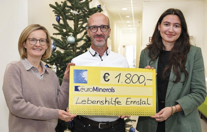 Nach altem Bergmannsbrauch veranstaltet Eurominerals mit Firmensitz in Lassing jährlich eine Barbarafeier. Heuer mit dabei waren rund 130 Mitarbeitende des Unternehmens und Gäste aus Österreich, Polen, Indien, Italien und Spanien. Der Erlös aus der an diesem Abend stattgefundenen Tombola kommt in diesem Jahr zum wiederholten Male der Lebenshilfe Ennstal zu Gute. Andreas Steer, Geschäftsführer der Lebenshilfe Ennstal (Mitte), konnte kürzlich einen Spendenscheck in der Höhe von 1800 Euro von Birgit Falter-Maringer (li.) und Katarina Ostojic (re.) von Eurominerals entgegennehmen.