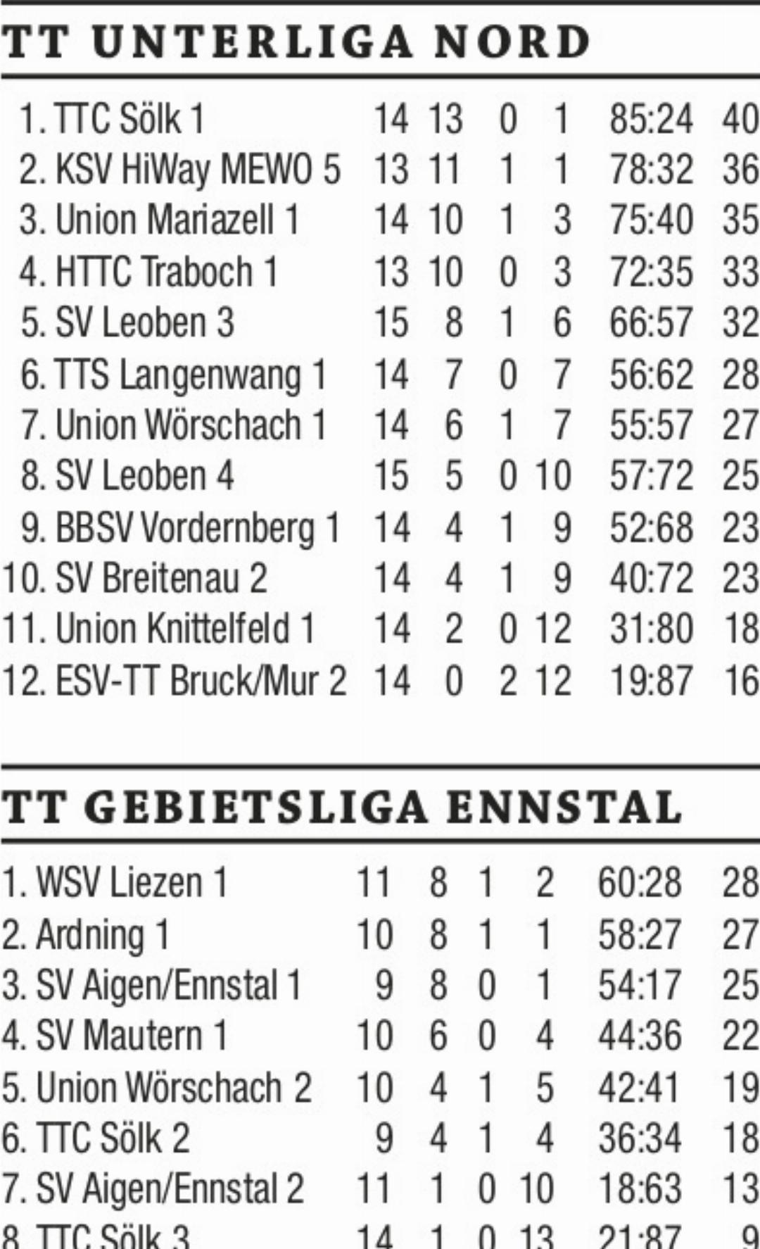 In der Gebietsliga Ennstal musste sich Tabellenführer WSV Liezen auswärts gegen TTC Sölk 2 mit 2:6 geschlagen geben. Bei den siegreichen Sölktalern gewann Maximilian Kerschbaumer drei Spiele und Hannes Reiter trug sich zweimal in die Siegerliste ein. Auch das Doppel wurde eine Beute von letzteren zwei Tischtenniscracks. Die zwei Punkte der Werkssportler gingen auf das Konto von Andreas Winkler und Viola Weichbold. Erstmals in dieser Saison geschlagen geben musste sich Ardning. Mit der überraschenden 3:6-Auswärtsniederlage gegen SV Mautern verpassten die zweitplatzierten Ardninger auch den Sprung an die Tabellenspitze. Die drei Punkte der Gäste gingen auf das Konto von Markus Thalhammer und Christian Dechler sowie dem Doppelduo Martin Stabentheiner/Christian Dechler. Union Wörschach 2 behielt auswärts gegen SV Aigen 2 erwartungsgemäß mit 6:3 die Oberhand. Beim Wörschacher Zweierteam hatte Oldboy Ewald Scheucher mit drei Zählern einen großen Anteil am Erfolg. Johann Huber verbuchte zwei Punkte und im Doppel setzte er sich mit Partner Ewald Scheucher durch. Bei den unterlegenen Hausherren gewann Fabian Roth zweimal und Ernst Tonkovitsch entschied eine Partie für sich.