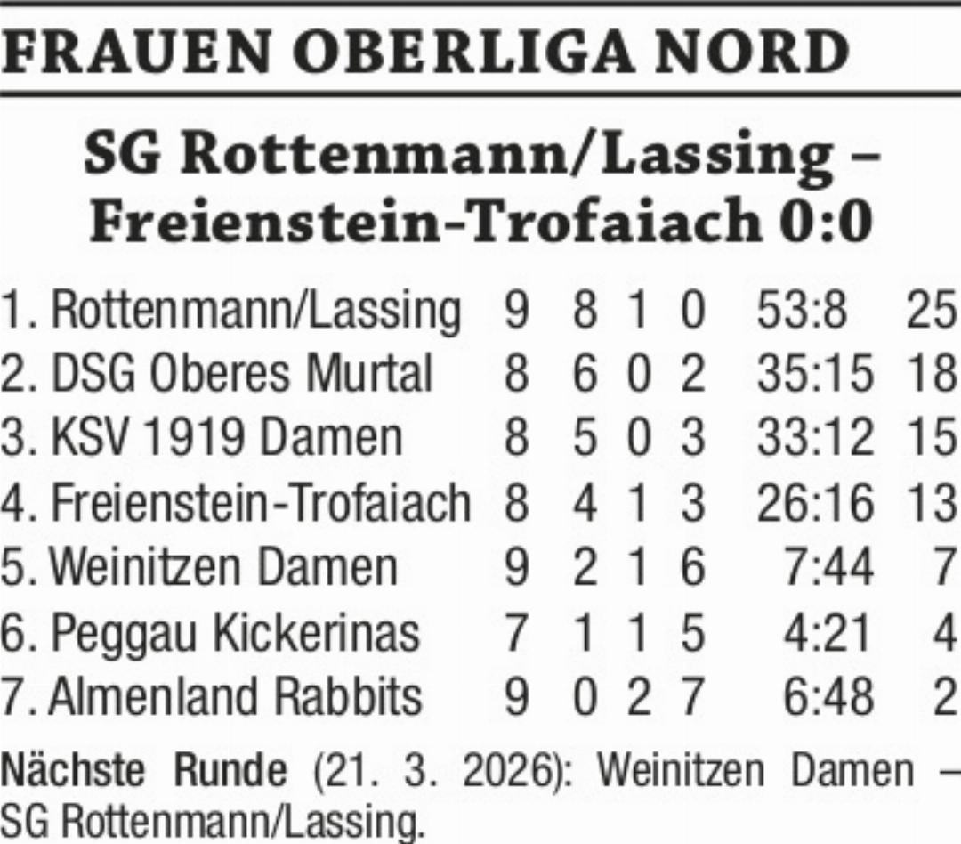 In der letzten Runde der Frauen-Oberliga Nord wollte Winterkönig SG Rottenmann/Lassing im Heimspiel gegen die Freienstein-Trofaiach Soccer Ladies den neunten Sieg in Serie feiern ...