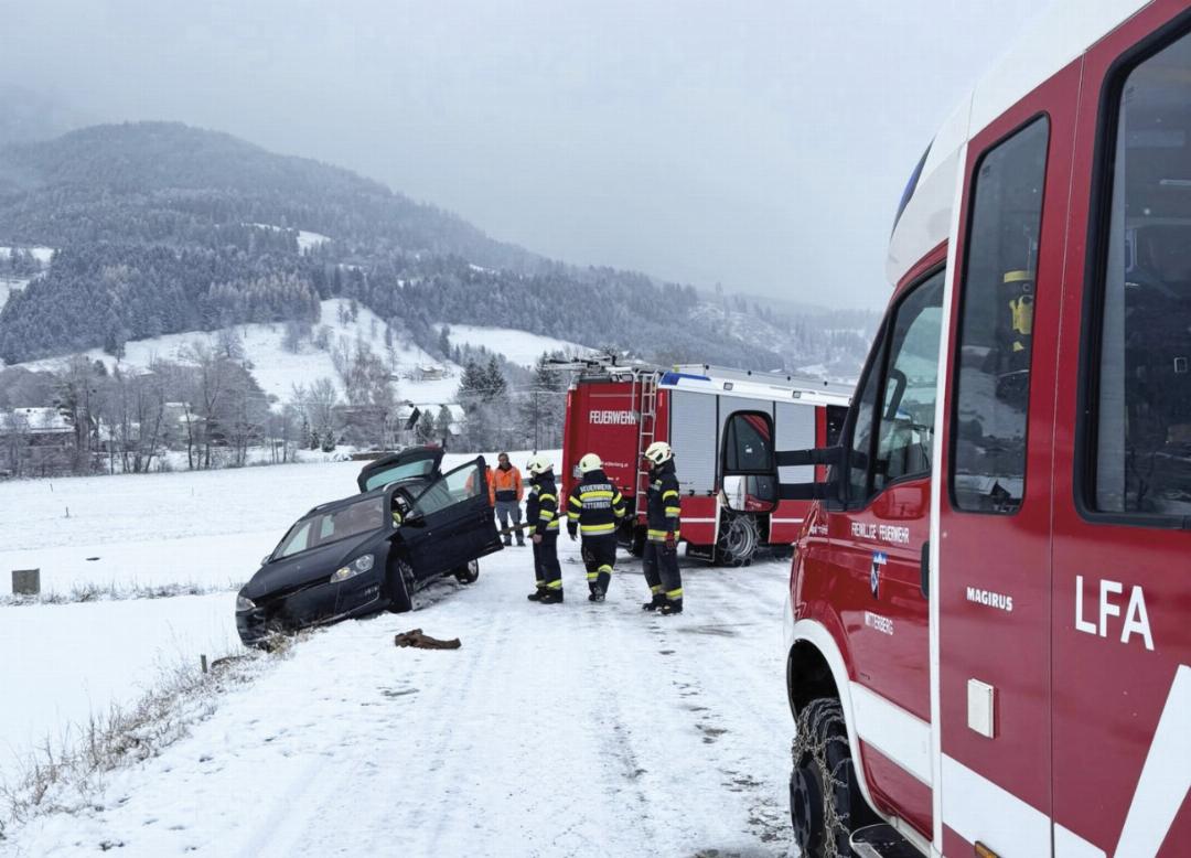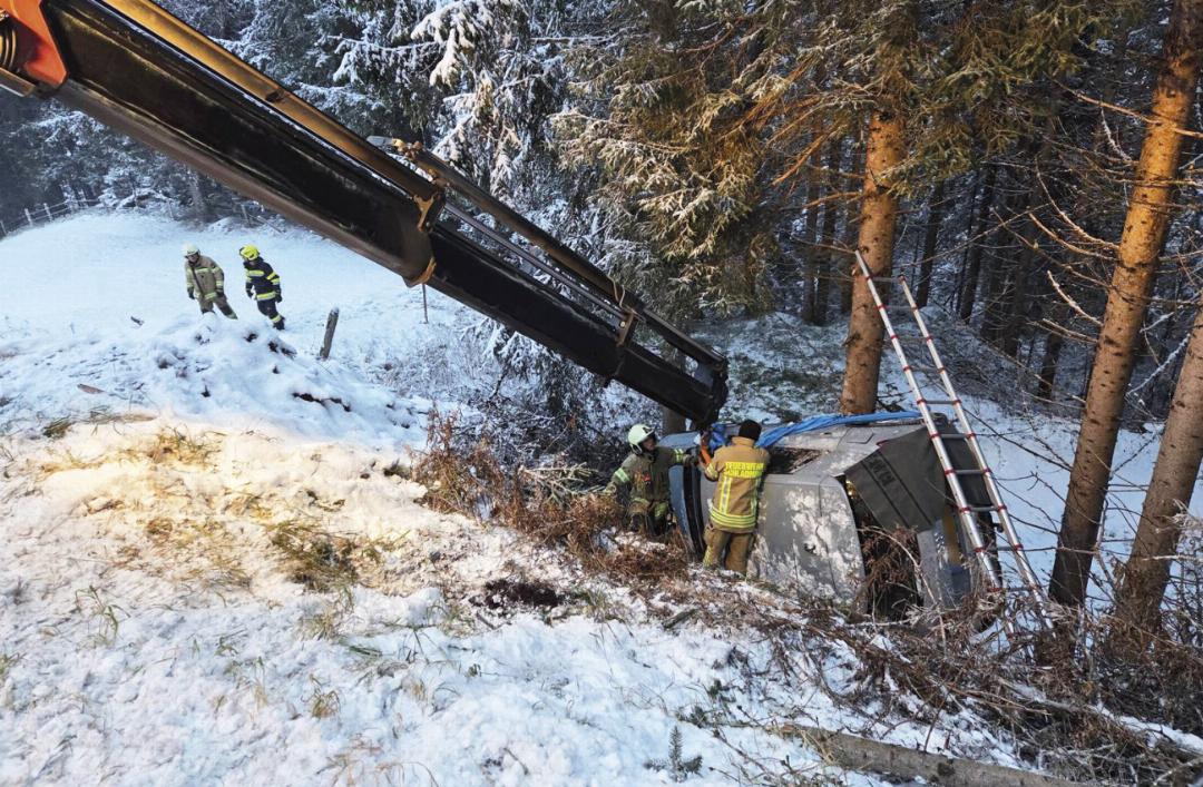 Auf schneebedeckter Fahrbahn kam auch in Preunegg ein Pkw von der Straße ab, überschlug sich und blieb zwischen Bäumen liegen. Die Feuerwehren Mandling-Pichl und Schladming bargen das Fahrzeug mithilfe von Kran und Seilwinde.