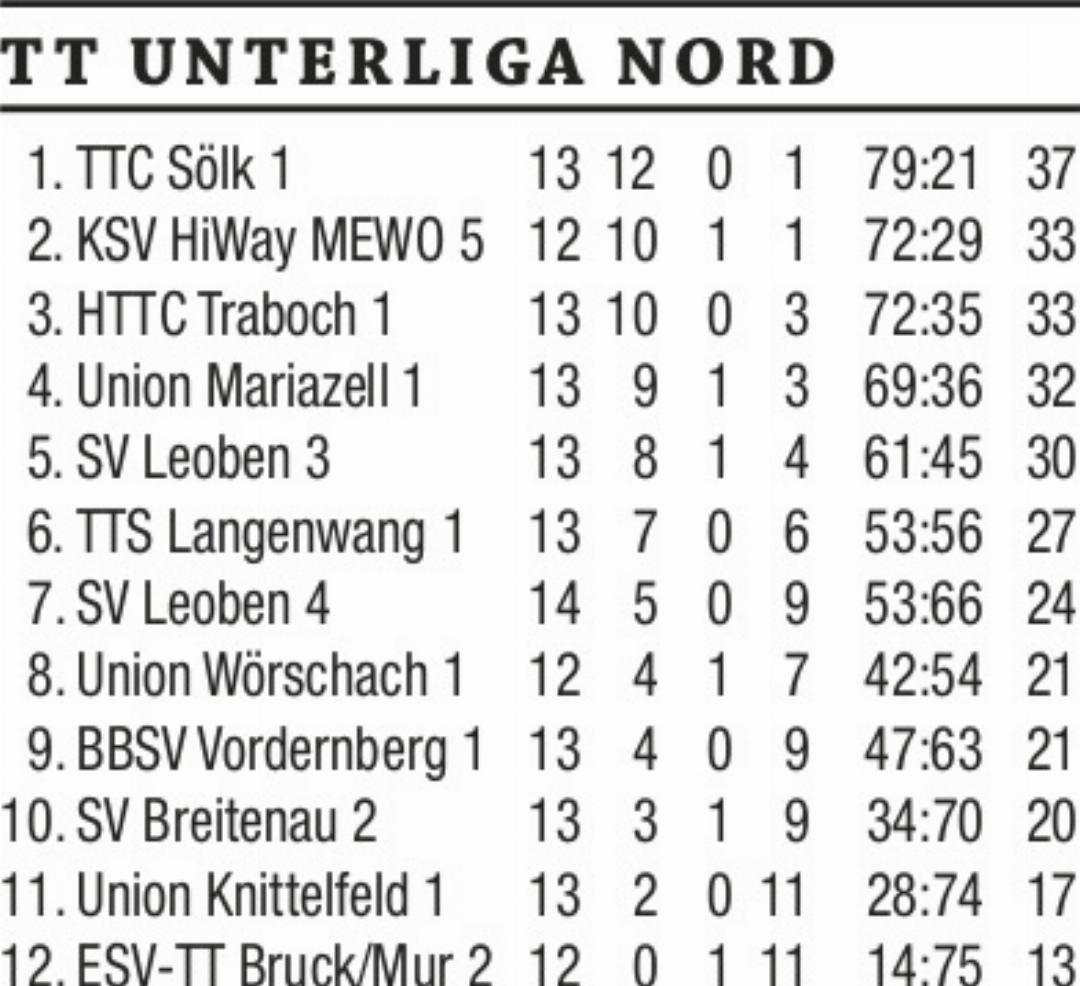 Erstmals seit der 3. Runde blieben in der zweiten Frühjahrsrunde wieder beide Bezirksmannschaften in der Unterliga Nord siegreich. Tabellenführer TTC Sölk ließ mit einem souveränen 6:1-Heimsieg gegen SV Breitenau im Zweikampf um den Meistertitel nichts anbrennen. Markus Aichholzer und Daniel Moser holten je zwei Siege und gewannen gemeinsam auch das Doppel. Der sechste Punkt ging auf das Konto von Stefan Mörschbacher. Beim Heimspiel von Union Wörschach gegen SV Leoben 4 war Marcel Neubauer erstmals seit langer Zeit wieder im Einsatz. Der Top-Spieler hatte bei seinem Comeback mit drei Einzelsiegen ohne Satzverlust gleich wieder einen riesigen Anteil am klaren 6:2-Triumph der Hausherren. Marc Friedl steuerte zwei Zähler bei und im Doppel fertigte letzterer Akteur mit Partner Marcel Neubauer die Gegner überlegen mit 3:0 ab.