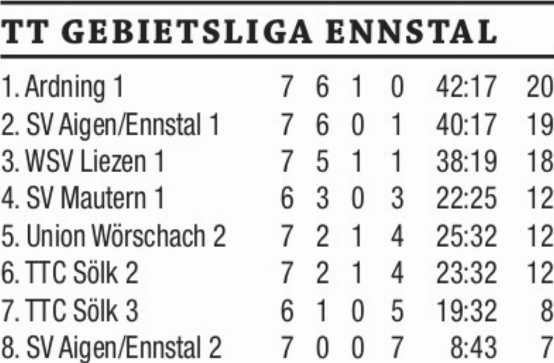 In der letzten Hinrunde der Gebietsliga Ennstal kam Tabellenführer Ardning zu Hause gegen WSV Liezen über ein 5:5-Unentschieden nicht hinaus. Bei den Ardningern punktete Mario Zach in bewährter Weise dreimal und gemeinsam mit Martin Stabentheiner gewann ersterer Akteur auch das Doppel. Den fünften Zähler holte Christian Dechler. Bei den Gästen waren Andreas Winkler und Vladimir Galis je zweimal erfolgreich, Florian Gruber zeichnete für den fünften Sieg verantwortlich. Mit diesem Punkteverlust musste Herbstmeister Ardning erstmals in dieser Saison Federn lassen und anderseits war das Remis für die Werkssportler ein schöner Erfolg. Der Tabellenzweite SV Aigen blieb dem Leader mit einem 6:2-Auswärtssieg gegen SV Mautern auf den Fersen. Jürgen Roth spielte in dem Match mit drei Siegen ohne Satzverlust groß auf. Zwei Punkte verbuchte Bernd Arrer und auch das Doppel wurde eine Beute der letzteren zwei Tischtenniscracks. SV Sölk 2 feierte zum Saisonabschluss beim Tabellenschlusslicht SV Aigen einen klaren 6:1-Triumph. Hannes Reiter sowie Peter Lerchegger trugen sich je zweimal in die Siegerliste ein und gewannen auch das Doppel ohne Satzverlust. Für den sechsten Zähler sorgte Maximilian Pilz. Den Ehrenpunkt der Hausherren brachte Fabian Roth ins Trockene.