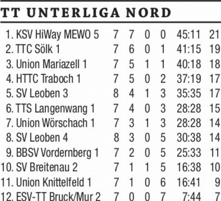 In der Unterliga Nord musste sich TTC Sölk nach sechs Siegen in Folge erstmals geschlagen geben. Die Sölker verloren zu Hause das Spitzenspiel gegen Tabellenführer KSV-Hiway-Mewo 5 mit 3:6 und büßten damit die weiße Weste ein. Daniel Moser gewann überraschend nur ein Spiel und fiel mit seinen ersten zwei Saisonniederlagen in der Rangliste vom ersten auf den 4. Platz zurück.