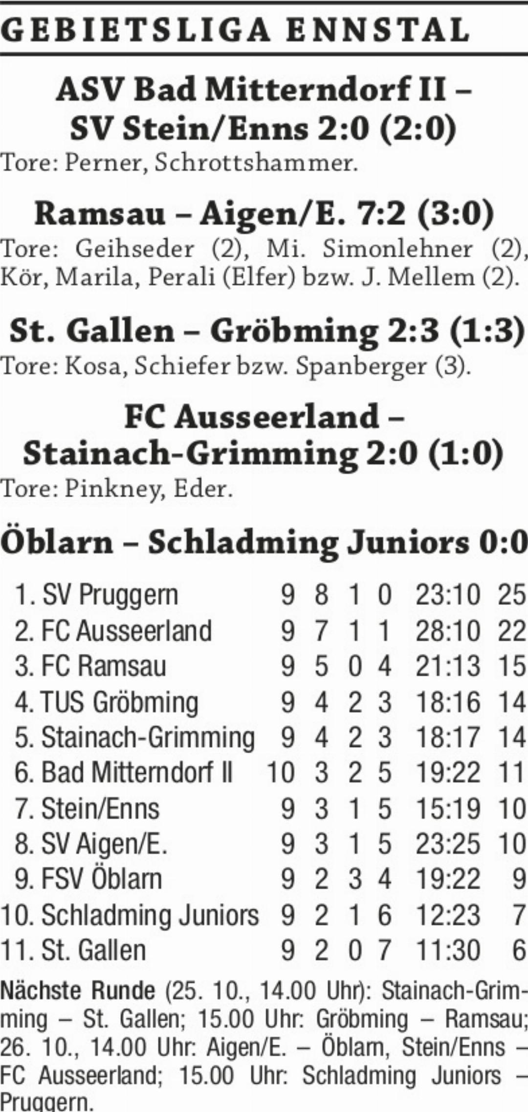 Mit dem 2:0-Heimsieg gegen SV Stein/Enns holte Bad Mitterndorf II drei wichtige Punkte im Abstiegskampf. Durch Tore von Matthias Perner und Armin Schrottshammer war das Match bereits zur Pause entschieden. FSV Öblarn und die Schladming Juniors trennten sich mit einem torlosen Unentschieden. Das Ergebnis spiegelt den Spielverlauf aber nicht wider, denn hüben wie drüben gab es zahlreiche Chancen und beide Mannschaften verzeichneten auch einen Aluminiumtreffer. Mit diesem Remis gaben die Schladminger Juniors die rote Laterne an den SV St. Gallen ab.