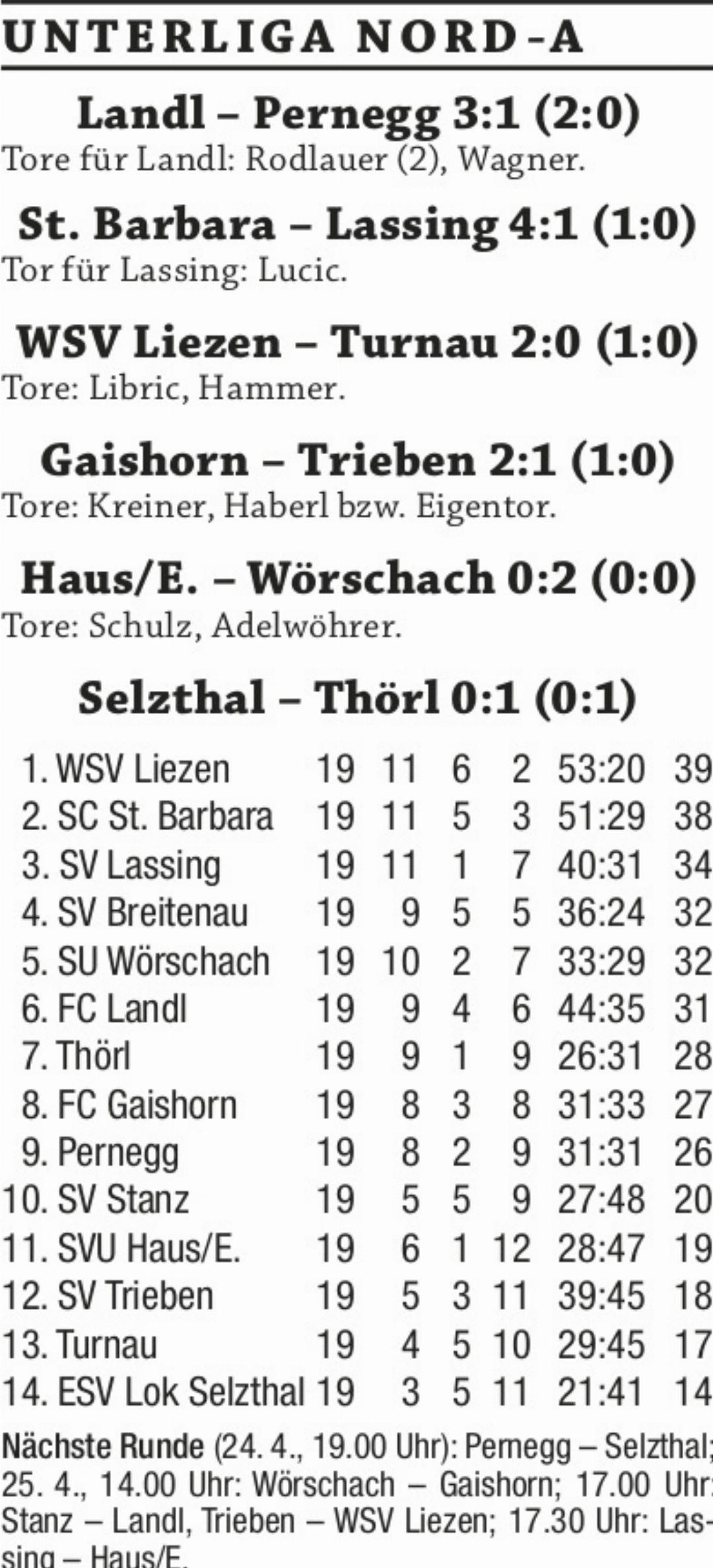 In der Unterliga Nord A verteidigte der WSV Liezen mit einem 2:0-Heimsieg gegen Turnau die Tabellenführung. Josip Libric erzielte in der 37. Minute die 1:0-Führung und 13 Minuten vor dem Schlusspfiff sorgte Dominik Hammer mit dem zweiten Tor für die Entscheidung zugunsten der Werkssportler. WSV-Trainer Kristijan Maleta sagte zum ersten Sieg nach drei Remis in Folge: „Mit der ersten Halbzeit war ich nicht zufrieden, doch nach der Pause war es eine gute Leistung meiner Mannschaft. Am Ende hätten wir auch um einiges höher gewinnen können.“