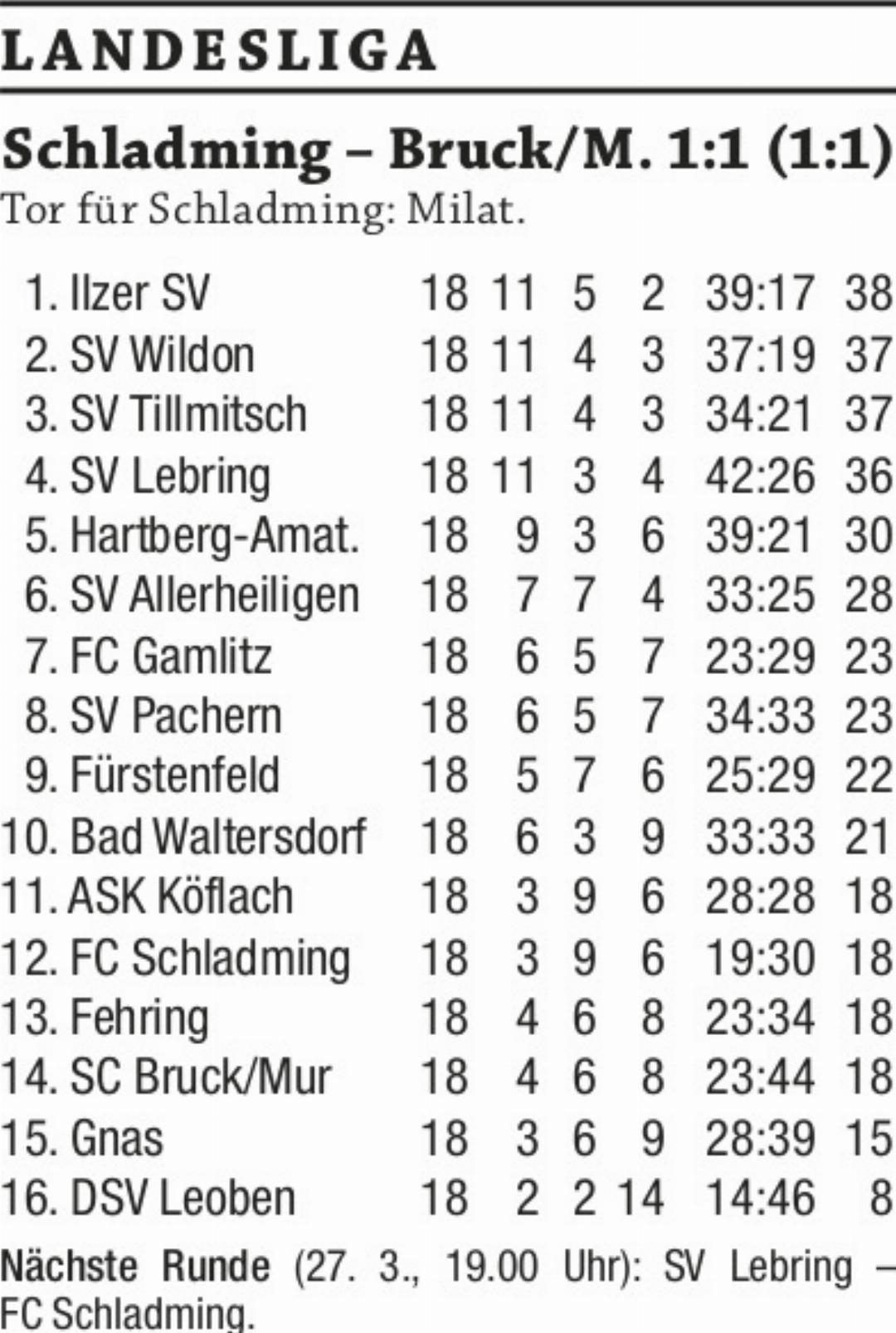Auch im achten Anlauf konnte der FC Schladming den Heimfluch in dieser Saison nicht ablegen. Die WM-Städter kamen im obersteirischen Derby gegen Bruck über ein 1:1-Remis nicht hinaus, und ...