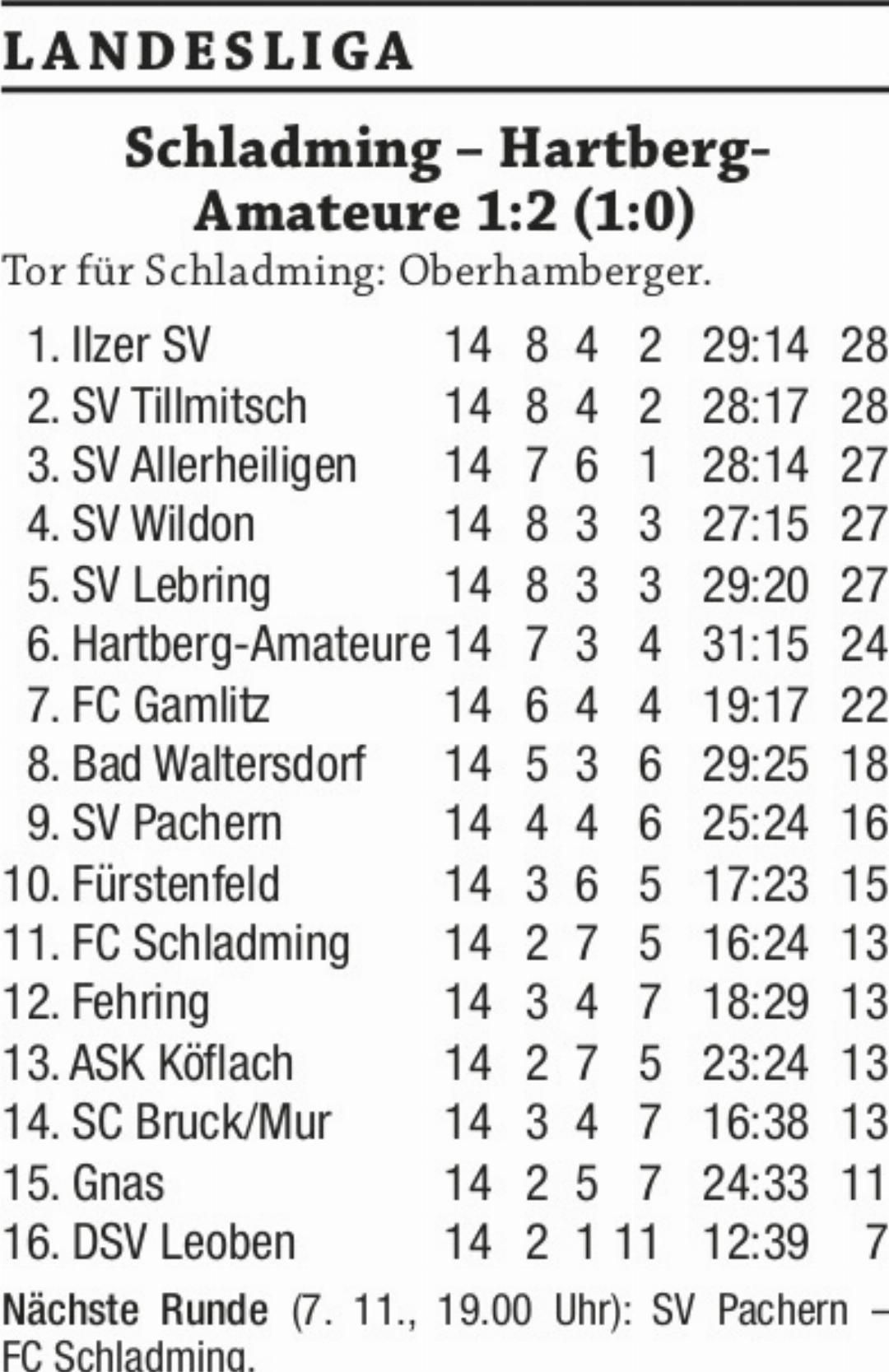 Auch im achten Anlauf konnte der FC Schladming über keinen Heimsieg in der Herbstsaison jubeln. Die WM-Städter verloren gegen Eggendorf/Hartberg-Amateure mit 1:2 und holten damit auf eigener Anlage in der Hinrunde nur magere vier Punkte. Vor 750 Zuschauern gehörte die erste Halbzeit klar den Hausherren und mit dem 0:1-Rückstand waren die Gäste noch gut bedient. Der Ennstaler Landesligist vergab vor der Pause mehrere Riesenchancen, unter anderem brachte Daniel Schönleitner das Leder bei einem Alleingang nicht im gegnerischen Gehäuse unter. In der 38. Minute erzielte dann Simon Oberhamberger die längst fällige 1:0-Führung. Nach dem Seitenwechsel zeigte sich dann ein anderes Bild. Die Oststeirer übernahmen vermehrt das Kommando und drängten auf den Ausgleich. In der 65. Minute fiel dann nach einem Eckball auch das 1:1 und sieben Minuten später drehten die Hartberger Youngsters das Match mit dem Tor zur 1:2-Führung um. In der Schlussphase hatte Martin Reiter noch eine hunderprozentige Möglichkeit auf den Ausgleich zum 2:2, doch letztendlich blieb es beim knappen Sieg der Gäste. Für Schladming-Trainer Michael Aigner war es eine vermeidbare Niederlage: „Wir hätten den Sack schon frühzeitig zumachen müssen. Nach dem Seitenwechsel war Hartberg stärker, wir waren in dieser Phase nicht kompakt genug. Wir schaffen es zu Hause nicht, einmal einen sogenannten dreckigen Sieg einzufahren.“