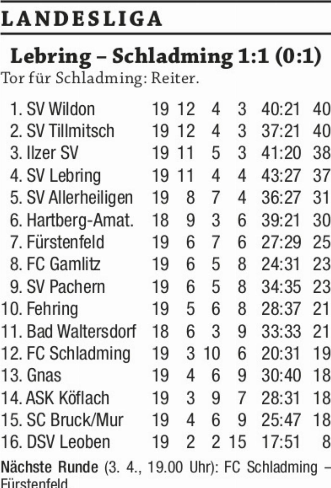 Mit einem 1:1-Unentschieden gegen Titelaspirant Lebring unterstrich der FC Schladming einmal mehr die Auswärtsstärke in der laufenden Saison. Die WM-Städter starteten mit viel Elan in die Partie und gingen bereits in der 11. Minute durch eine Traumaktion in Führung. Marcel Lep brachte Martin Reiter im Sechzehner mit einem Zuckerpass in Front und dieser erzielte dann in sehenswerter Manier das 0:1. Zwei Minuten nach Wiederbeginn glichen die Südsteirer mit einem verwandelten Foulelfmeter zum 1:1 aus. Der Ennstaler Landesligist ließ sich durch den Gegentreffer aber nicht aus der Ruhe bringen. Die Abwehr stand weiterhin bombensicher und bei Konterangriffen setzte man immer wieder Nadelstiche. Wie bereits im vergangenen Spiel gegen Bruck vergab Antonio Solaja in der Schlussminute mit einem Lattenköpfler abermals die Chance auf einen Sieg. Mit dem 1:1-Remis verteidigte Schladming den 12. Tabellenplatz.