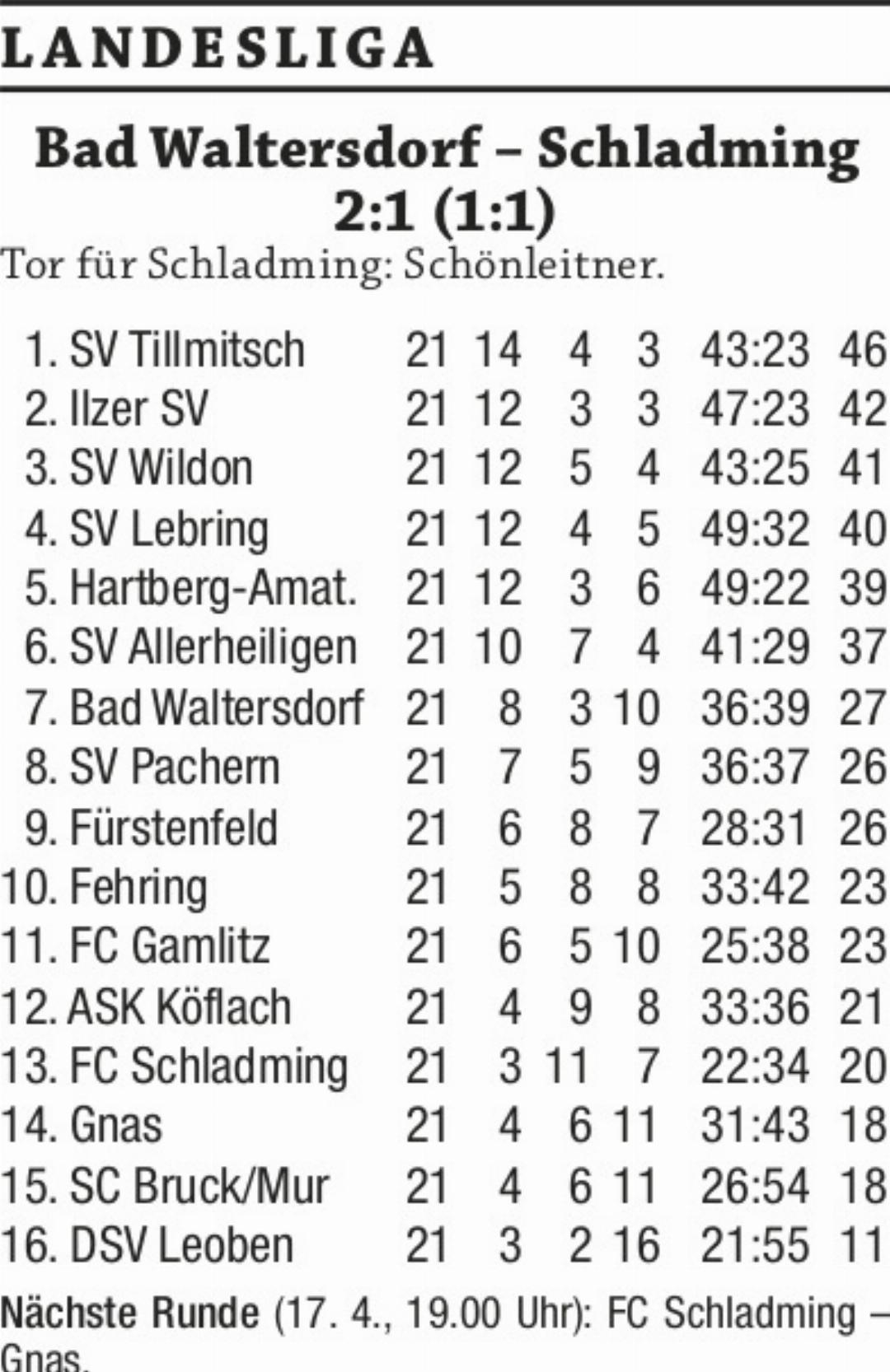 Mit einer bitteren 1:2-Niederlage im Gepäck musste Landesligist FC Schladming die Heimreise aus Bad Waltersdorf antreten. Neben den langzeitverletzten Spielern mussten die WM-Städter in der Partie ...