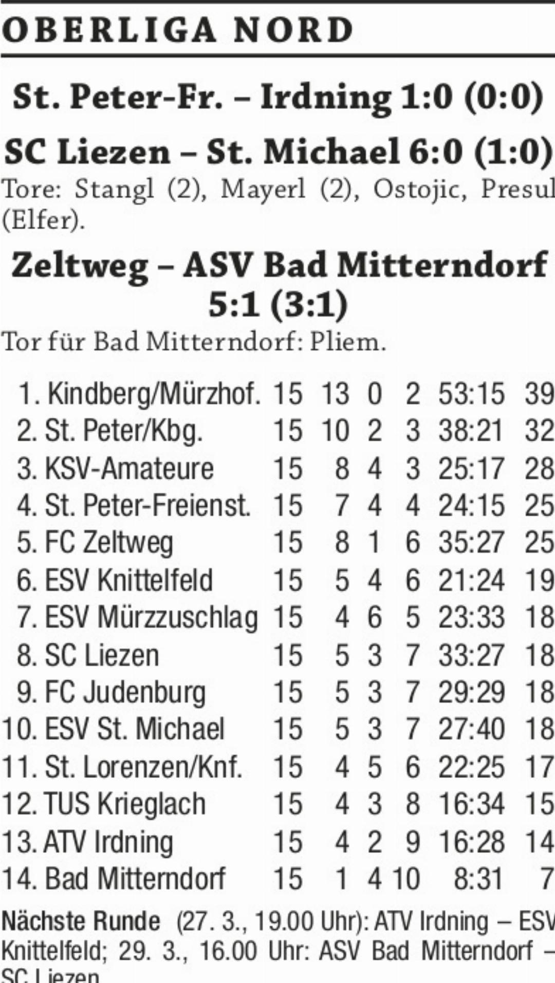 Für Schlusslicht ASV Bad Mitterndorf wird es immer enger. Die 1:5-Auswärtsniederlage gegen FC Zeltweg war die dritte Pleite in Folge, und damit beträgt der Rückstand auf den Vorletzten bereits sieben Punkte. Nach einem schnellen 0:2-Rückstand gelang Thomas Pliem in der 22. Minute der Anschlusstreffer zum 1:2. Im weiteren Verlauf konnten die Salzkammerguter aber keine entscheidenden Akzente setzen und mussten so zum zehnten Mal als Verlierer vom Platz gehen.