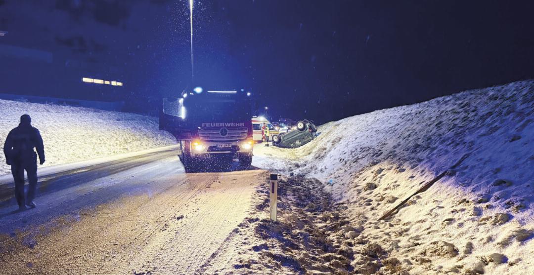 Die Freiwillige Feuerwehr Aich wurde am Montag, dem 16. Februar, in den Morgenstunden per Sirene zu einem Verkehrsunfall auf der B 320 alarmiert. Ein Fahrzeug war ins Schleudern geraten, von der Fahrbahn abgekommen und auf dem Dach liegend zum Stillstand gekommen. Beim Eintreffen der Einsatzkräfte wurde die verunfallte Person bereits vom Roten Kreuz versorgt. Glücklicherweise blieb sie unverletzt.