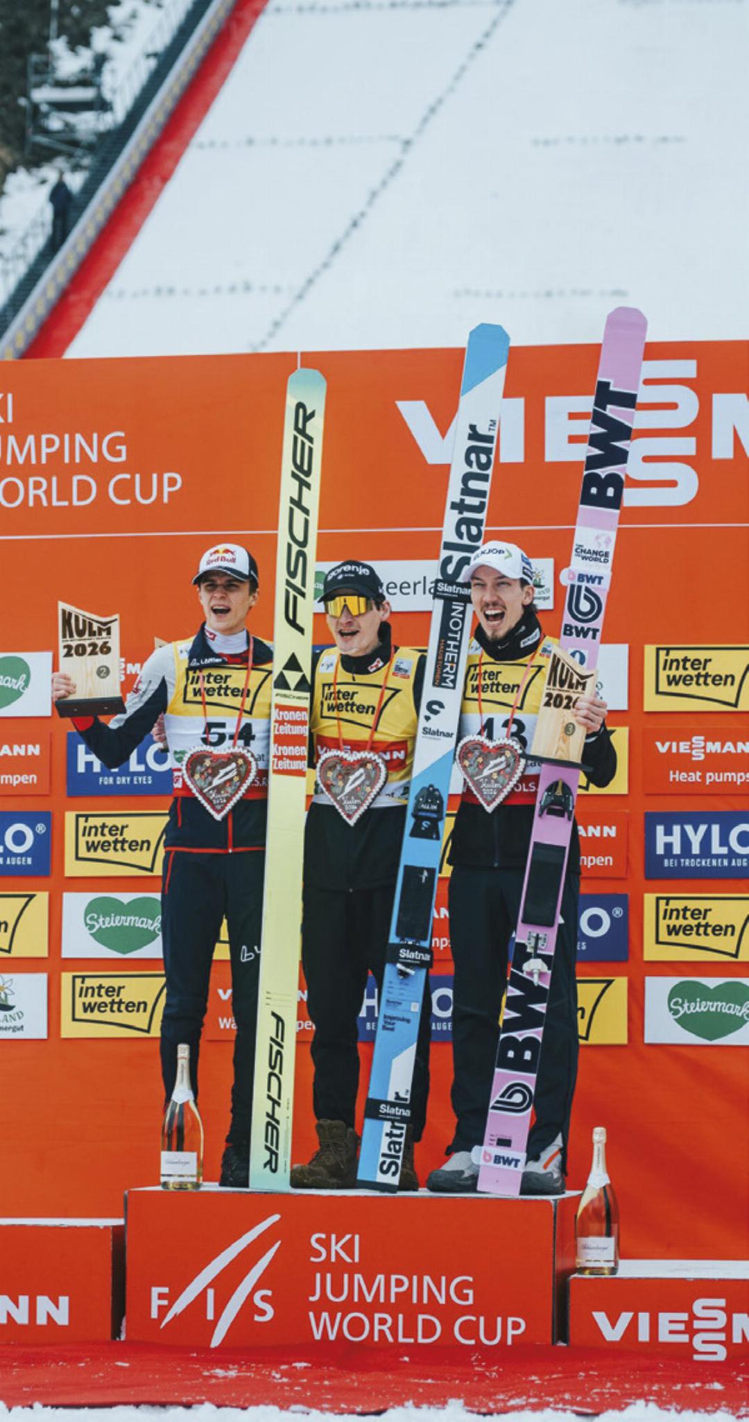 Nach der Premiere der Nordischen Kombination sorgten am Samstag auch die Skiflugspezialisten für eine Show. Vor 13.100 Fans wurde der erste von zwei Weltcupbewerben zu einem Wintersportfest mit Gänsehautmomenten und herausragenden österreichischen Leistungen. Stephan Embacher setzte sich mit einem Flug auf 223 Meter an die Spitze und ging als Halbzeitführender in das Finale. In der Pause sorgten die Red Bull Flying Bulls mit einer spektakulären Flugshow für zusätzliche Begeisterung. Im Finaldurchgang zeigte sich der slowenische Dominator der Saison, Domen Prevc, mit der Tageshöchstweite von 228,5 Metern einmal mehr in Bestform und sicherte sich hauchdünn den Sieg. Nur 1,1 Punkte dahinter durfte sich Stephan Embacher über einen starken zweiten Platz freuen. Jonas Schuster jubelte als Dritter über seinen ersten Podestplatz im Weltcup. Daniel Tschofenig (4.) und Maximilian Ortner (5.) komplettierten das mannschaftliche Ergebnis der Österreicher.