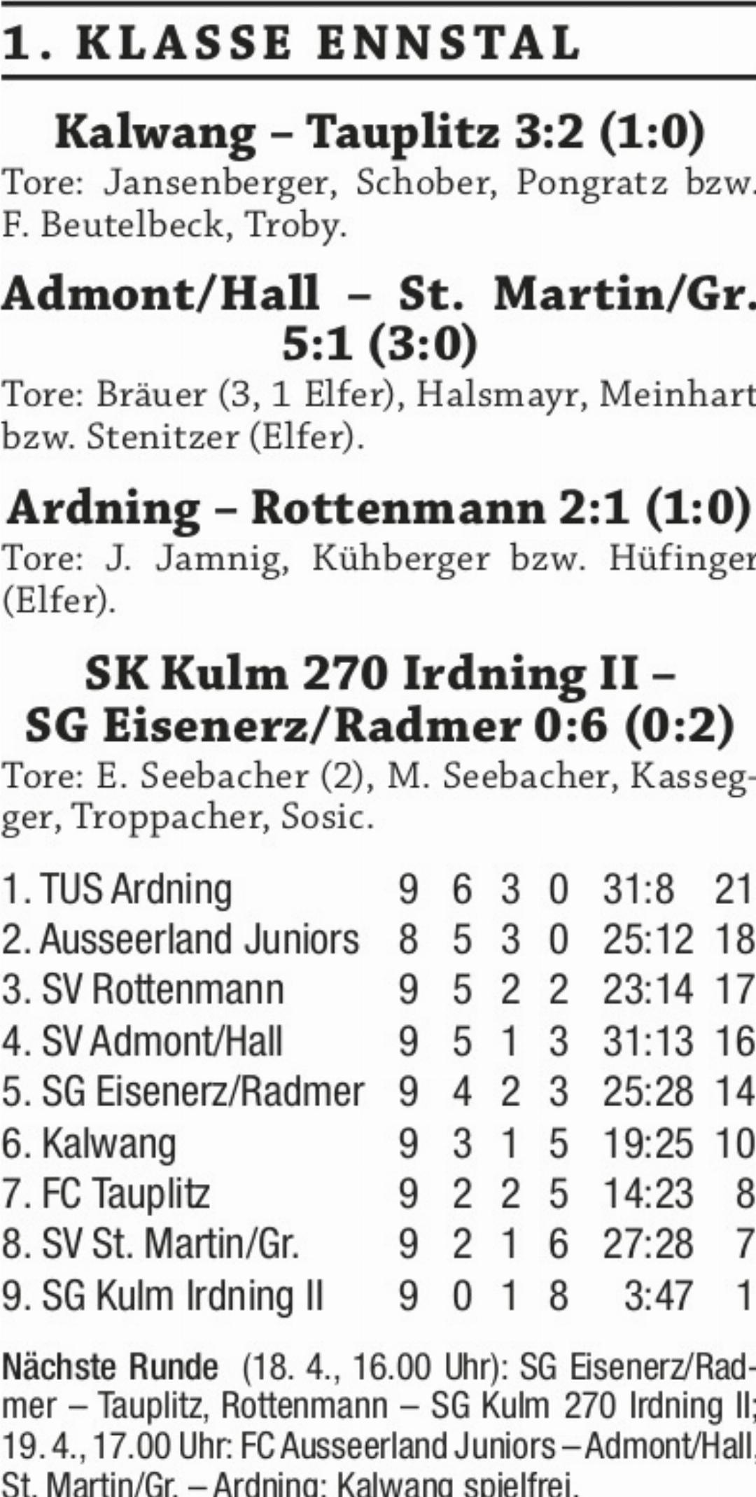 Mit dem klaren 5:1-Heimsieg gegen SV St. Martin feierte Marco Paurevic ein erfolgreiches Debüt als Trainer des SV Admont/ Hall. Mit dem Erfolg wahrten die Stiftskicker die kleine Titelchance. Im Duell der Tabellennachbarn feierte Kalwang gegen den FC Tauplitz einen 3:2-Heimsieg. Die Gäste egalisierten einen 0:2-Rückstand, doch letztendlich fixierte Christoph Pongratz in der 85. Minute den Dreipunkter der Liesingtaler. Mit diesem Sieg überholte Kalwang den Kontrahenten in der Tabelle. Mit einer bitteren 0:6-Heimschlappe gegen die SG WSV Eisenerz/SV Radmer verlief das Debüt des Trainerduos Arno Rieberer/Gerhard Posch bei der SG Kulm 270 Irdning II nicht nach Wunsch.