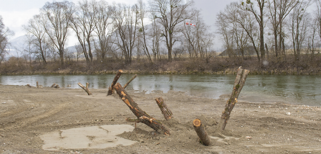 Noch gleicht der Uferbereich in Stainach einer gewaltigen Baustelle. Berge von Wurzeln und von schweren Baumaschinen durchzogene Erdflächen prägen das Bild. Die ausgegrabenen Wurzeln und Baumstämme werden gezielt wieder im Uferbereich eingebaut. Gemeinsam mit Totholz und Steinen an den Böschungen sollen sie eine fließende Übergabe an die Natur erleichtern.