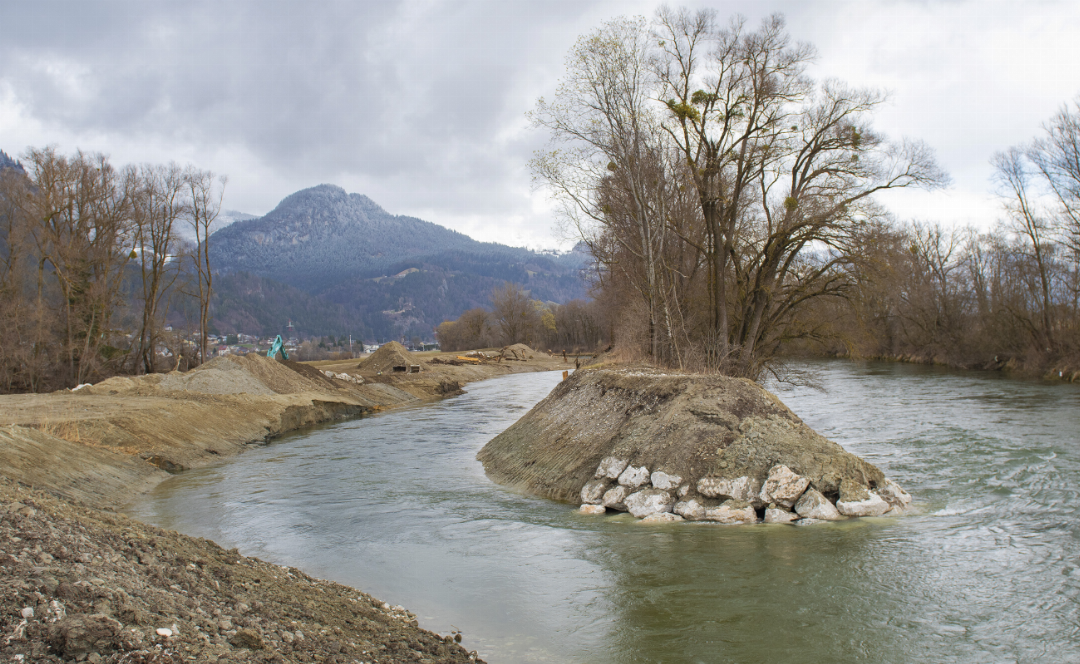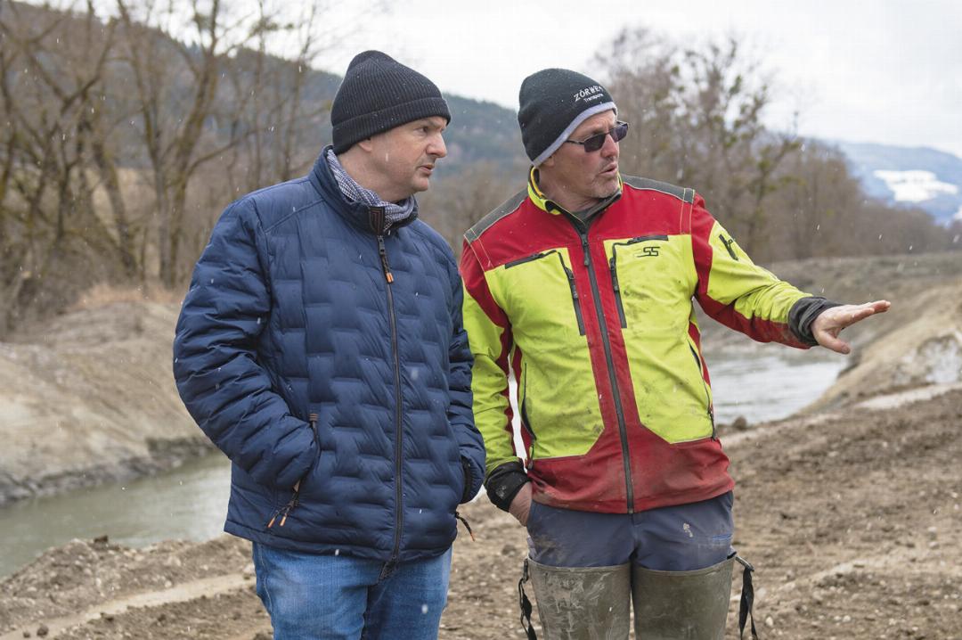 Exakt dort, wo die Enns-Trasse verlaufen hätte sollen, wird ein vollkommen gegensätzliches Projekt realisiert. Statt Beton bekommt der Fluss Raum zurück. Im Rahmen der „Life Iris“-Initiative werden begradigte Abschnitte renaturiert. „Wäre die Trasse gebaut worden, wäre eine Renaturierung hier nicht möglich“, sagt Baubezirksleiter Martin Reiter-Puntinger. Nun entstehen in Stainach auf einer Länge von 1,2 Kilometern drei Initialgerinne. Damit verdoppelt sich die Breite des Gewässers stellenweise von 50 auf 100 Meter. Grundablöse war dazu keine notwendig. Das ist schon im Zuge der Planungsarbeiten für die Enns-Trasse geschehen. Strategisch platzierte Buhnen am gegenüberliegenden Ufer lenken die Strömung gezielt in diese neuen Seitenarme. Hinter diesen Strömungslenkern entstehen zudem beruhigte Zonen, die Fischen und ihrem Laich wichtigen Schutz bieten. Ein wertvoller Nebeneffekt: Diese Buchten helfen dabei, die negativen Auswirkungen des Schwallbetriebs der Kraftwerke in den oberen Zubringerbächen abzufedern. Ein Damm an der Nordseite der Enns schützt die dahinterliegenden Nutzflächen vor Hochwasser.