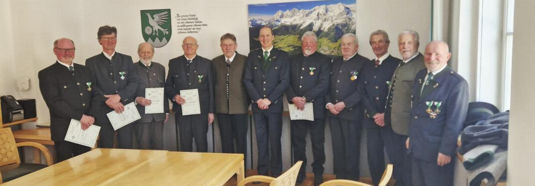 Im Gemeindeamt Ramsau am Dachstein fanden kürzlich Ehrungen des Österreichischen Kameradschaftsbundes statt. ÖKB-Vizepräsident und Hauptbezirksobmann Walter Schwab sowie Bürgermeister Johannes Uttinger würdigten dabei verdiente Mitglieder für ihr langjähriges und engagiertes Wirken im Kameradschaftsbund. Im feierlichen Rahmen wurden folgende Auszeichnungen überreicht: Bruno Klinkan erhielt das Landesverdienstkreuz in Bronze, Gerhard Stocker jenes in Silber. Mit dem Goldenen Ehrenzeichen wurde Manfred Tritscher ausgezeichnet. Das Landesverdienstkreuz in Gold ging an Adam Schiefer, Johann Leutgab und Norbert Schrempf.