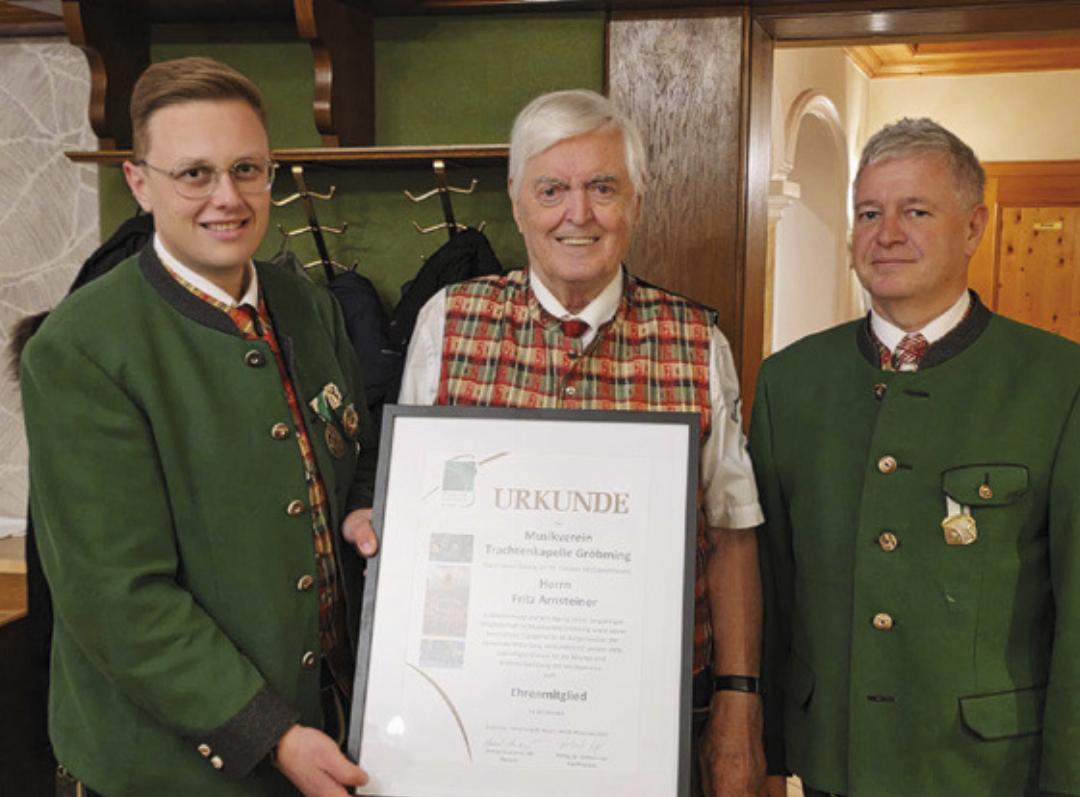 07.11.2025 SeitenblickeIm Rahmen seines 85. Geburtstags wurde Altbürgermeister Fritz Arnsteiner (Mitte) zum Ehrenmitglied des Musikvereins Trachtenkapelle Gröbming ernannt. Mit dieser Auszeichnung würdige man seine langjährige Verbundenheit, Unterstützung und seinen tatkräftigen Einsatz ...