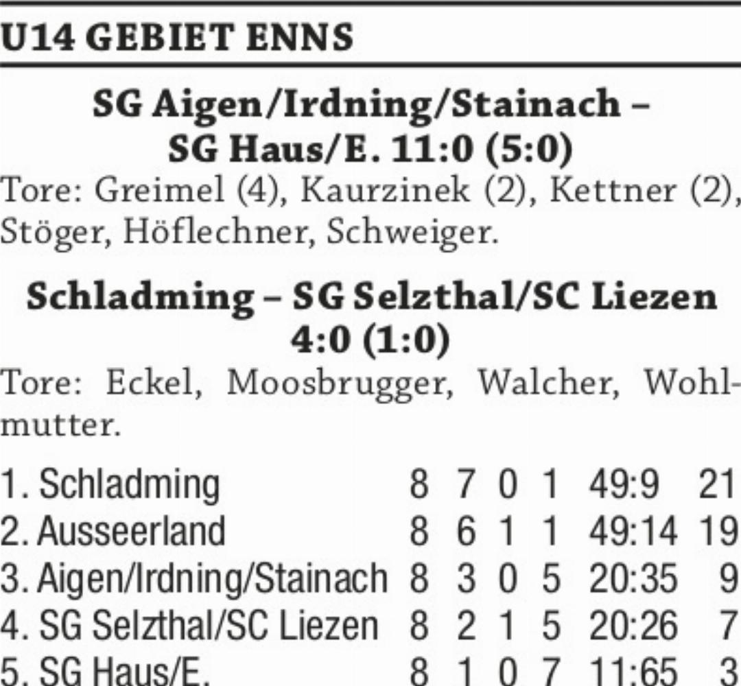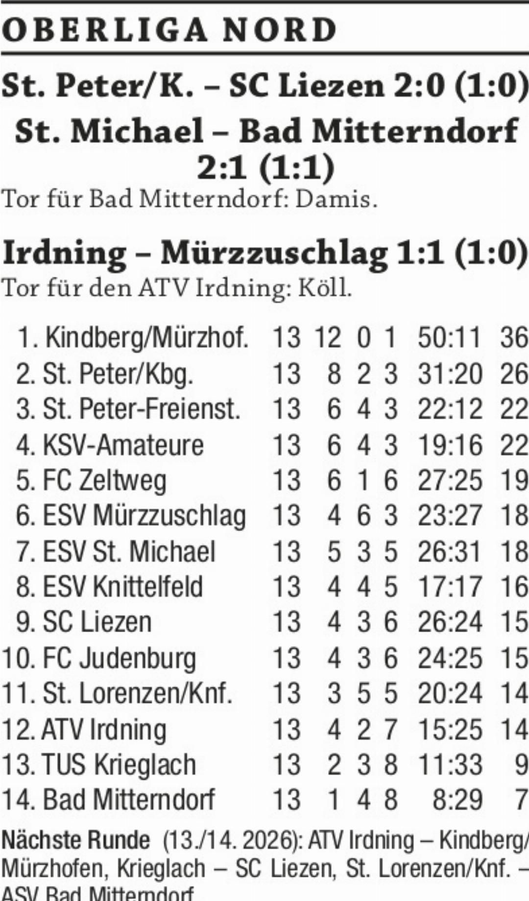 ATV Irdning bleibt mit dem 1:1 gegen ESV Mürzzuschlag zum vierten Mal in Folge ungeschlagen. SC Liezen trotz Niederlage beste Bezirksmannschaft, rote Laterne für ASV Bad Mitterndorf.