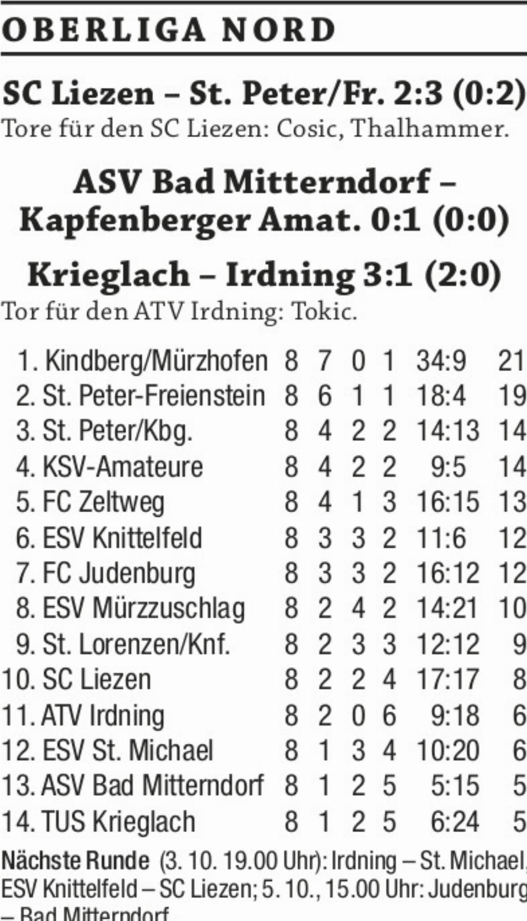 Der ATV Irdning musste im Auswärtsspiel gegen Tabellenschlusslicht Krieglach eine bittere 1:3-Niederlage hinnehmen. Die Irdninger vergaben in der Anfangsphase nicht weniger als vier hochkarätige Chancen und das sollte sich letztendlich rächen. Die Hausherren gingen in der 27. Minute mit ihrer ersten Möglichkeit in Führung und erhöhten zehn Minuten später durch ein unglückliches Eigentor der Gäste auf 2:0. Sechs Minuten nach dem Seitenwechsel fiel in dem Match mit dem Tor zum 3:0 die Vorentscheidung zugunsten der Mürztaler. Der Anschlusstreffer durch Matteo Tokic in der 88. Minute zum 3:1-Endstand für Krieglach war letztendlich nicht mehr von Bedeutung. Irdnings Sportchef Willi Danklmaier sagte zur fünften Niederlage in Serie: „Wir hätten den Sack bereits in der Anfangsphase zumachen können. Mit Fortdauer fielen wir aber immer mehr zurück. Am Ende war der ersten Saisonsieg des Aufsteigers verdient. Unsere junge Mannschaft hat zweifelsohne noch Probleme, um mit dem Druck umzugehen“.