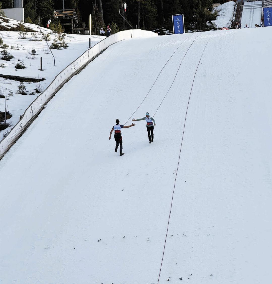 Laufen, ziehen, jubeln: Bei der Premiere von „Pull up the Hill“ auf der HS98-Skisprungschanze in Ramsau am Dachstein ging es ordentlich zur Sache. Wo sonst Skispringer für weite Flüge sorgen, kämpften diesmal 60 Teams um den Titel im wohl schrägsten Zweierlauf des Jahres. Zwei Personen sind beim Wettkampf über ein 120 Meter langes Seil mit Umlenkrolle miteinander verbunden. Während eine den Hang hinunter sprintet, läuft die andere gleichzeitig über den Aufsprunghang nach oben. Nach einer rasanten Qualifikation wurde im K.o.-System um jede Sekunde gekämpft. Am Ende jubelten die Ramsauer Langläufer Finn Hammerer und Matvej Ermolov über den Sieg, Platz zwei ging an Anton Buchner und Florian Lutzmann, Platz drei sicherten sich die Brüder Jonas und Mathias Fischbacher.