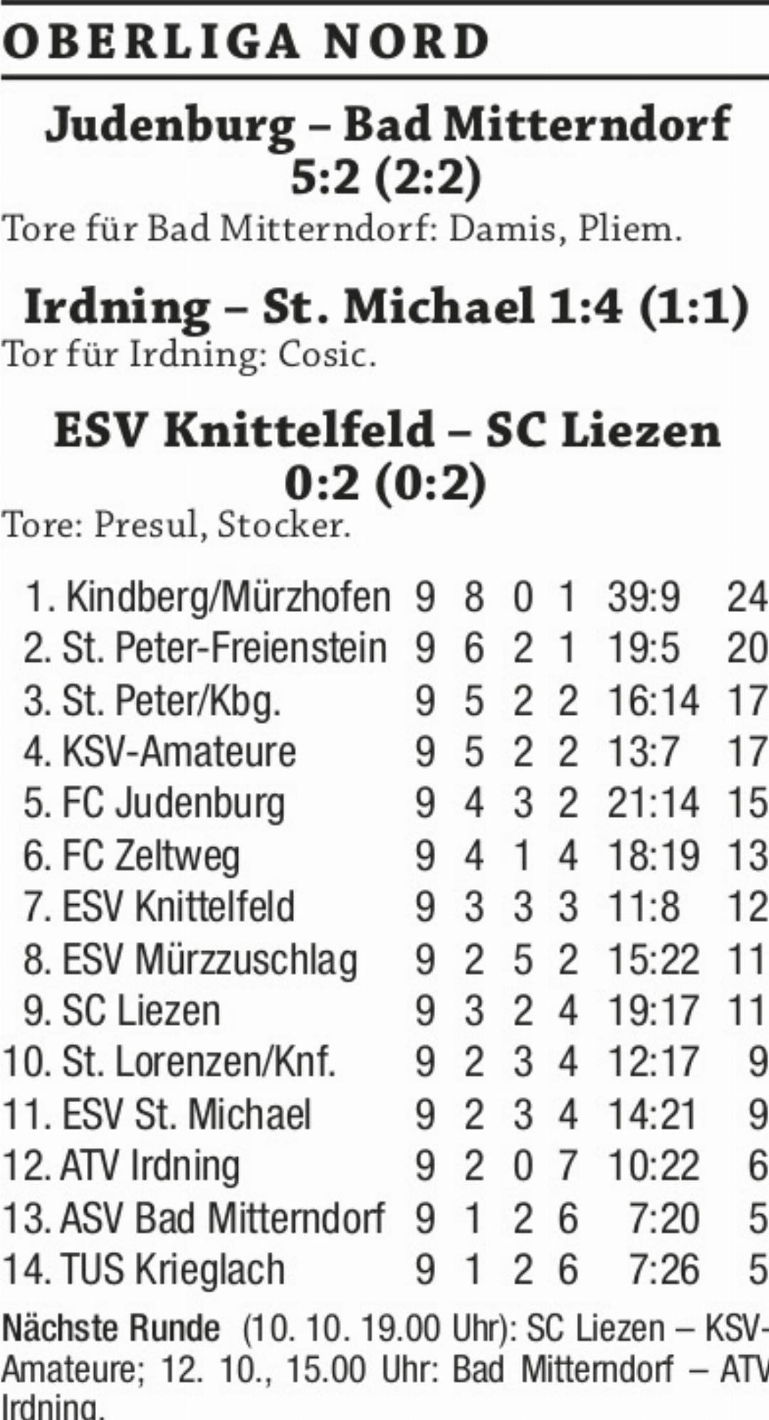 10.10.2025 SportBittere Heimniederlage für ATV Irdning im Sechspunktespiel gegen St. Michael. Bad Mitterndorf kassierte gegen Judenburg vierte Auswärtspleite in Folge.