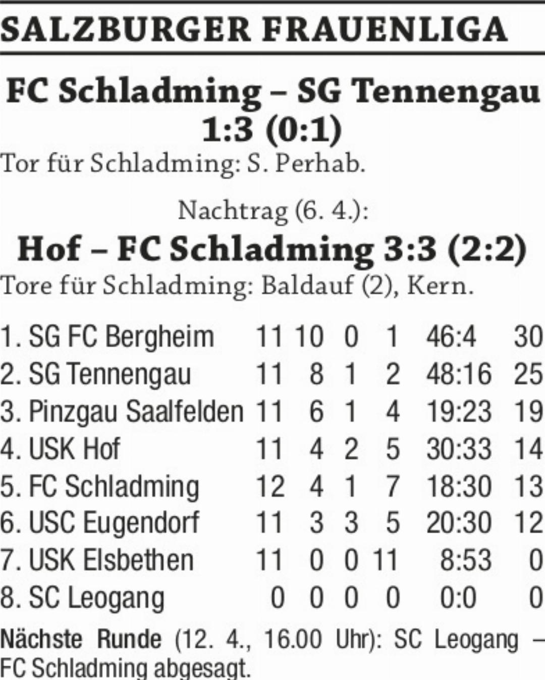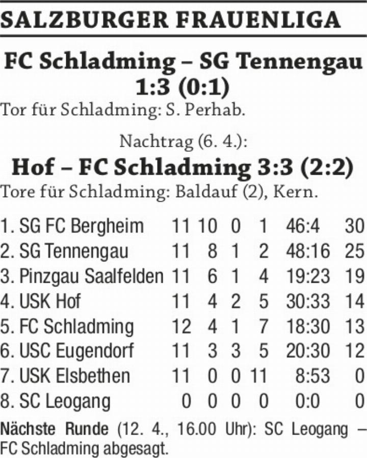 Im auswärtigen Nachtragsspiel gegen USK Hof am Ostermontag erreichten die Schladmingerinnen ein 3:3-Unentschieden. Nach einem schnellen 0:1-Rückstand glich Lisa Baldauf in der 8. Minute zum 1:1 aus. In der 36. Minute brachte Selina Kern die Schladminger Fußballgirls mit 2:1 in Führung. Nur drei Minuten später trafen die Hausherrinnen zum 2:2-Pausenstand. In einer großteils ausgeglichenen zweiten Halbzeit sorgte Lisa Baldauf in der 76. Minute mit ihrem zweiten Treffer für die neuerliche Führung. Die Freude beim Gästeteam währte aber nur kurz, denn nur zwei Minuten später erzielte USK Hof den Ausgleich zum 3:3 und das war letztendlich auch der Endstand in der Partie. In der kommenden Runde ist die Damenmannschaft des FC Schladming spielfrei.