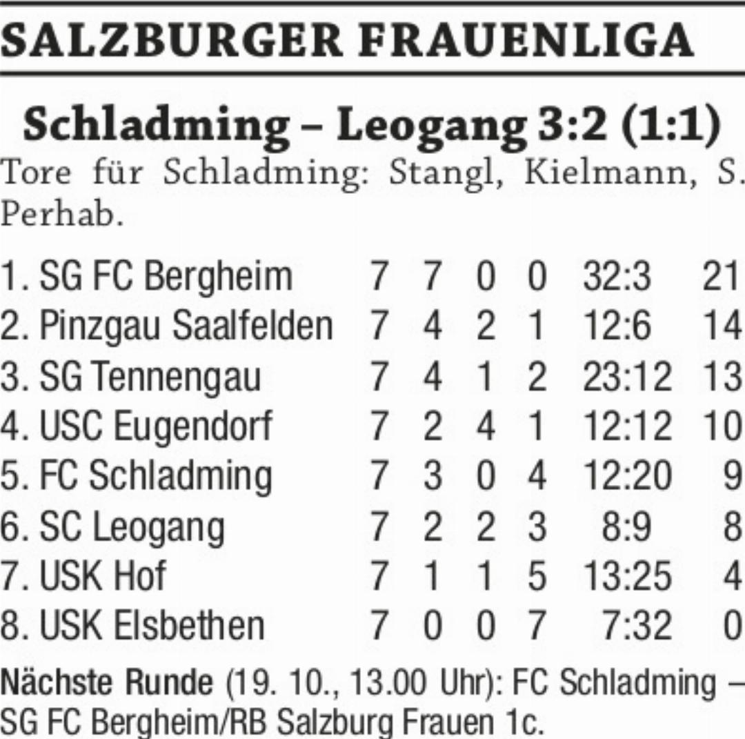 Am morgigen Samstag steht das zweite Heimspiel in Folge gegen den souveränen Tabellenführer SG FC Bergheim RB Salzburg Frauen 1 C auf dem Programm (Beginn: 13 Uhr). In diesem Duell kann die Schladminger Damenelf wohl nur trachten, sich so gut wie möglich zu verkaufen und damit die drohende Niederlage in Grenzen zu halten.