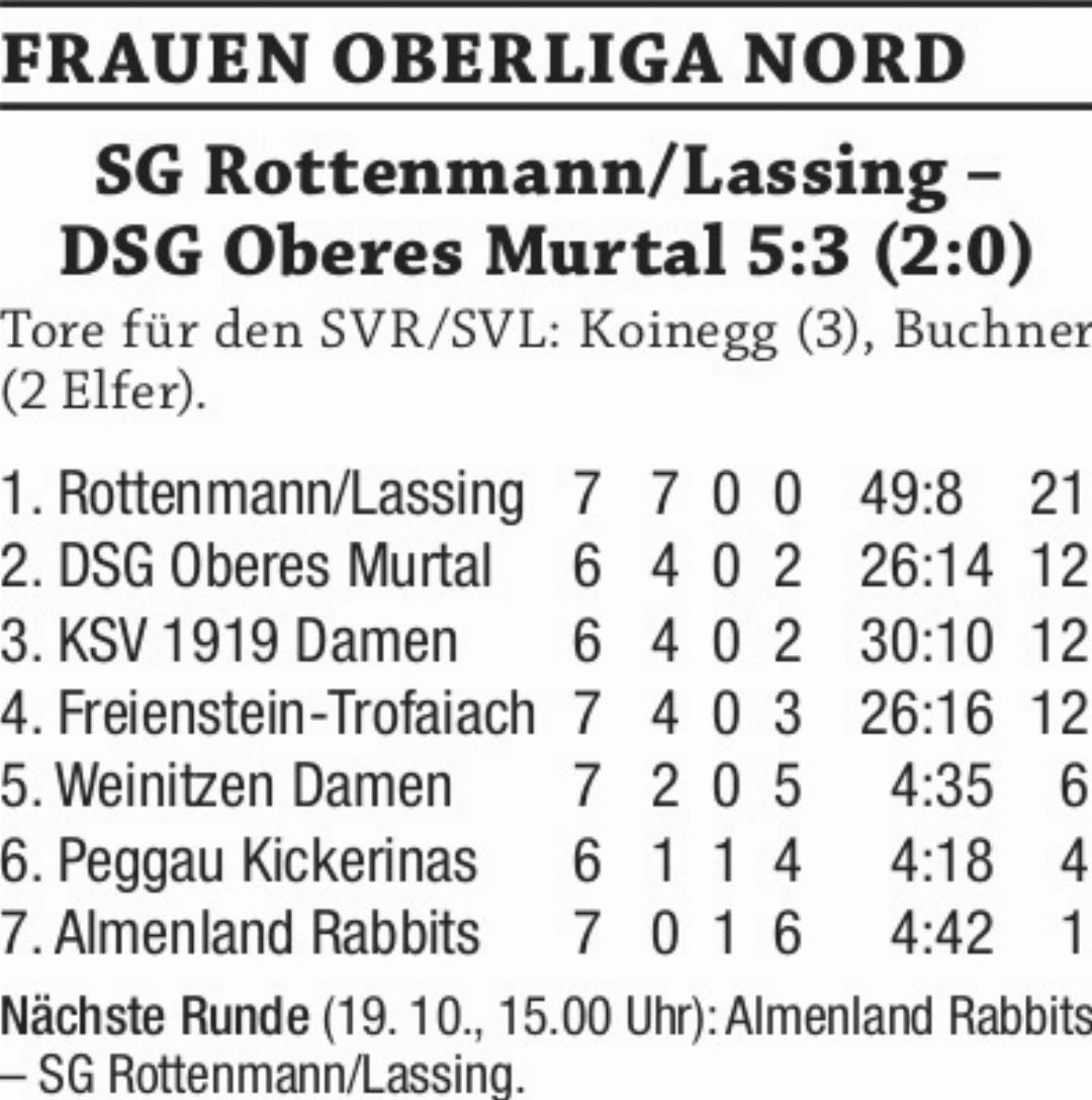 In der steirischen Frauen-Oberliga Nord kürte sich Tabellenführer SG Rottenmann/Lassing mit einem 5:3-Heimerfolg gegen Verfolger DSG Oberes Murtal/Oberwölz zwei Runden vor Schluss zum Herbstmeister. Durch Tore von Sofia Koinegg und einem verwandelten Elfmeter von Simone Buchner führte der Spitzenreiter in dem intensiv geführten und trefferreichen Spiel zur Pause mit 2:0. Sieben Minuten nach Wiederbeginn gelang den Gästen der Anschlusstreffer zum 2:1, aber nur kurz darauf stellte Sofia Koinegg den Zwei- Tore-Vorsprung wieder her. Die Murtalerinnen steckten aber nicht auf und glichen in weiterer Folge zum 3:3 aus. In der 88. Minute sorgte Sofia Koinegg mit ihrem dritten Treffer in dem Match für die 4:3-Führung und nur Sekunden später fixierte Simone Buchner mit dem zweitem Elfmetertor den 5:3-Erfolg. Mit dem siebenten Sieg in Folge bewiesen die SVR/ SVL-Fußballgirls eindrucksvoll, dass sie ein würdiger Winterkönig sind. Am kommenden Sonntag ist die SG Rottenmann/Lassing beim Tabellenschlusslicht Almenland Rabbits (Beginn: 15 Uhr) zu Gast. In diesem Match geht es wohl nur um die Höhe des Sieges für die Gäste.