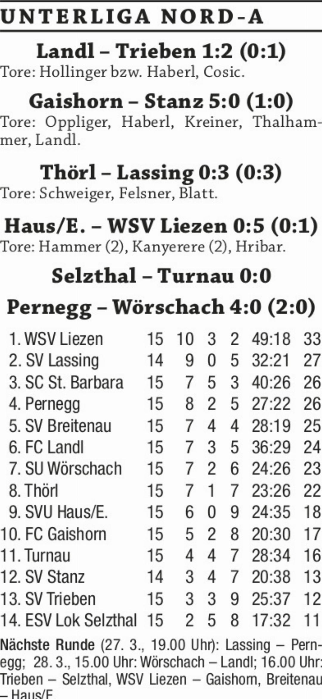 SV Lassing feierte dank einer starken ersten Halbzeit gegen SV Thörl einen 3:0-Auswärtssieg. Durch den Punkteverlust von SC St. Barbara sind die Lassinger nun erster Verfolger von Leader WSV Liezen. Nach dem klaren Auftaktssieg gegen SV Haus blieb der FC Gaishorn mit einem überlegenen 5:0-Sieg gegen SV Stanz auch im zweiten Heimspiel in Serie erfolgreich. Mit diesem Erfolg machte die Mannschaft von Trainer Alfred Wieser im Abstiegskampf weiter an Boden gut. Nach der starken Leistung beim vorwö- chigen Heimsieg gegen Thörl gab es für SU Wörschach mit der klaren 0:4-Auswärtsniederlage gegen Pernegg einen kleinen Dämpfer.