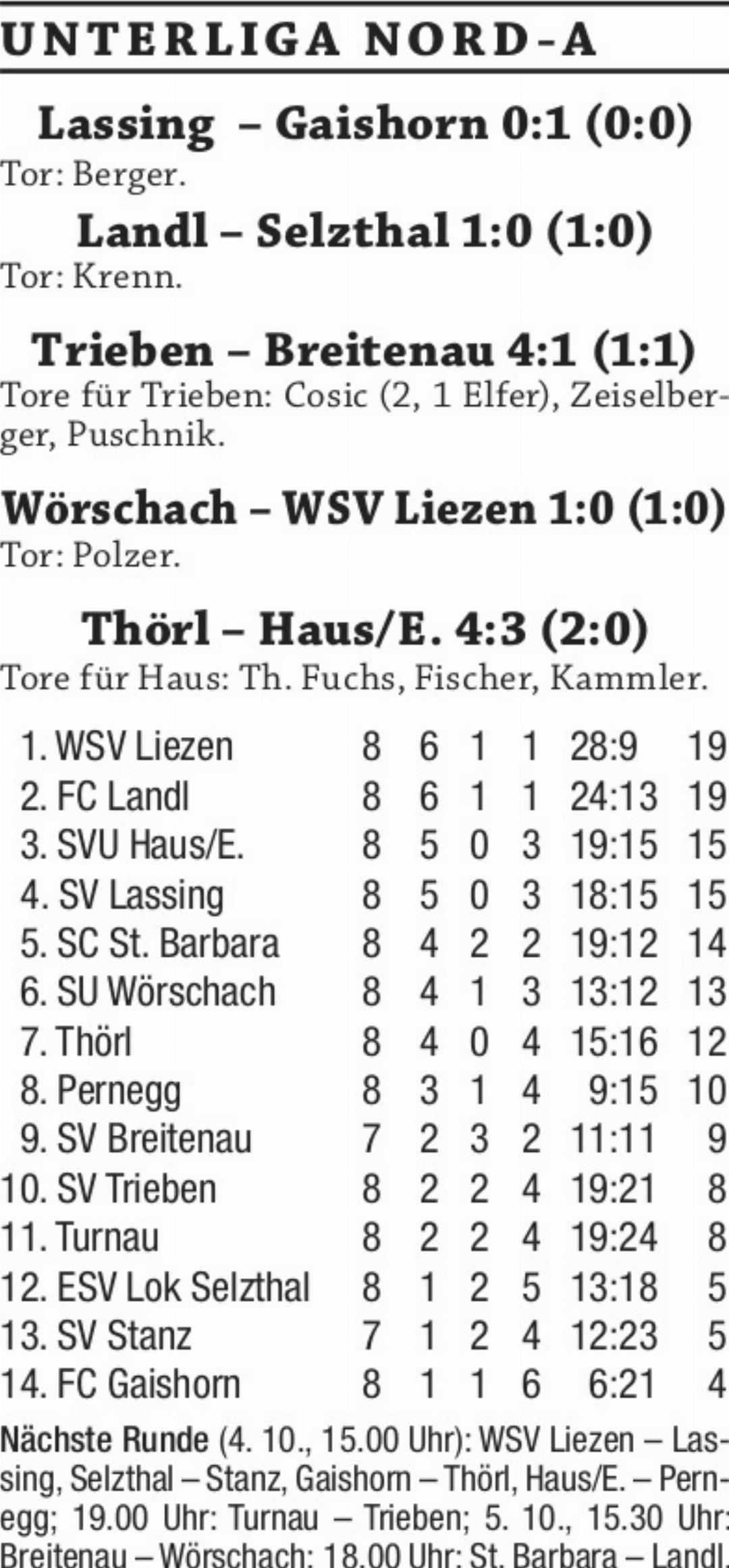 In einem spannenden Spiel musste sich SV Haus gegen SV Thörl auswärts mit 3:4 geschlagen geben. Nach einem 0:2-Pausenrückstand drehten die Gäste das Match in der zweiten Halbzeit zunächst um. Drei Minuten nach Wiederbeginn erzielte Thomas Fuchs den Anschlusstreffer und mit einem Doppelschlag durch Daniel Fischer sowie Hannsgernot Kammler gingen die Ennstaler mit 2:3 in Führung. In den Schlussminuten kam es dann aber dick für die Hauser. Die Mürztaler glichen in der 87. Minute zum 3:3 aus in der Nachspielzeit gelang den Hausherren der glückliche Siegestreffer zum 4:3-Endstand. SV Trieben rehabilierte sich mit einem 4:1-Heimerfolg gegen Breitenau für die vorwöchige Derbyniederlage gegen WSV Liezen. Ivan Cosic egalisierte in der 30. Minute mit einem verwandelten Elfmeter die 0:1-Führung der Gäste und zwölf Minuten nach dem Seitenwechsel brachte derselbe Spieler die Magnesitstädter mit 2:1 in Front. Mit zwei Toren in der 78. sowie 81. Minute fixierten Benjamin Zeiselberger und Jan Puschnik den zweiten Saisonsieg endgültig.
