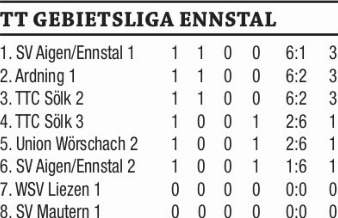 In der 1. Runde der Gebietsliga Enns gewann TTC Sölk 2 das Derby gegen die Dreiermannschaft mit 6:2. Hannes Reiter punktete dabei dreimal und Peter Lerchegger war zweimal erfolgreich. Auch das Doppel wurde eine Beute der zwei Tischtennis-Cracks. Die zwei Siege des unterlegenen Sölker Teams holten Reinhold Tassatti und Maximilian Kerschbaumer. Im zweiten internen Duell feierte SV Aigen 1 gegen Aigen 2 einen klaren 6:1-Erfolg. Jürgen Roth und Bernd Arrer gingen je zweimal als Sieger von der Platte und auch im Doppel siegte das Duo. Den sechsten Zähler steuerte Nico Roth bei. Für den Ehrenpunkt der Verlierer sorgte Fabian Roth. Ardning 1 startete mit einem 6:2-Auswärtssieg gegen Union Wörschach 2 in die Saison. Mario Zach gab bei seinen drei Einzelsiegen nur einen Satz ab und im Doppel setzte er sich gemeinsam mit Martin Stabentheiner knapp mit 3:2 durch. Die restlichen zwei Erfolge brachten Markus Thalhammer und Martin Stabentheiner ins Trockene. Für die Hausherren war Ewald Scheucher zweimal erfolgreich.