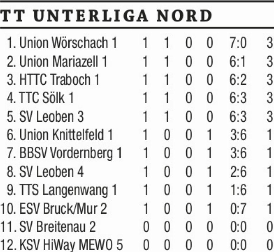 Erfolgreich starteten die zwei Unterliga-Nord-Mannschaften des Bezirkes Liezen in die neue Saison. Aufsteiger TTC Sölk 1 feierte bei der Rückkehr in die dritthöchste steirische Spielklasse nach vier Jahren einen 6:3-Auswärtssieg gegen Vordernberg 1. Mit drei Einzelpunkten und dem Erfolg im Doppel gemeinsam mit Markus Aichholzer legte Daniel Moser den Grundstein zum Auftaktsieg. Die weiteren zwei Zähler gingen auf das Konto von Stefan Mörschbacher und Markus Aichholzer. Union Wörschach fertigte im ersten Spiel der Herbstsaison ESV-TT Bruck/Mur zu Hause mit 7:0 ab. Emanuel Wesner, Stefan Pfatschbacher und Marcel Neubauer trugen sich je zweimal in die Siegerliste ein. Letzterer Akteur behielt auch im Doppel mit Partner Marc Friedl die Oberhand.