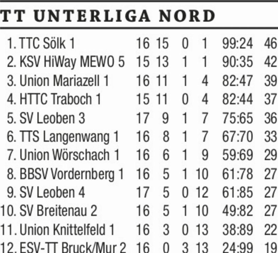 Mit einem überlegenen 7:0-Auswärtssieg gegen SV Leoben 4 hielt Unterliga-Nord-Tabellenführer TTC Sölk den Verfolger Kapfenberg 5 auf Distanz. Gegen die mit nur zwei Spielern angetretenen Heimischen gaben Daniel Moser, Markus Aichholzer und Stefan Mörschbacher keinen einzigen Satz ab. Union Wörschach musste sich auswärts gegen SV Leoben 3 mit 2:6 geschlagen geben. Bei den unterlegenen Gästen punkteten Marc Friedl und Stephan Pfatschbacher.