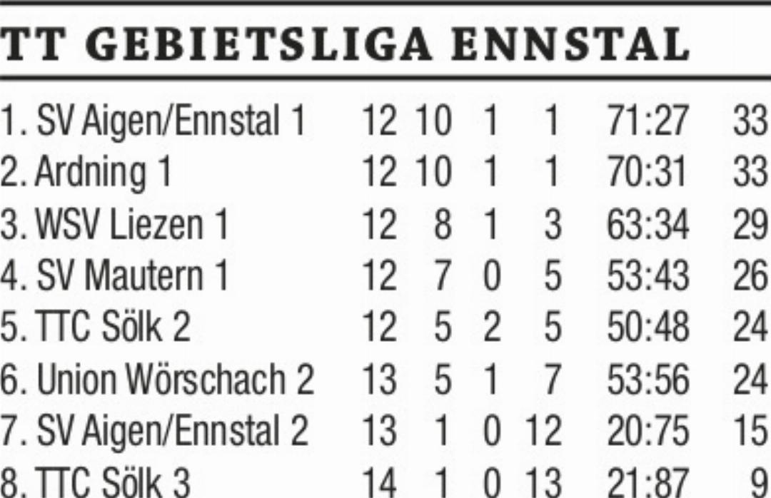 In der vergangenen Runde der Gebiestsliga Ennstal gaben sich die zwei punktegleich an der Spitze liegenden Mannschaft SV Aigen und Ardning keine Blöße. Tabellenführer SV Aigen feierte gegen Union Wörschach 2 einen 6:2-Heimsieg. Jürgen Roth und Bernd Arrer gewannen je zwei Einzelpartien und auch im Doppel behielten letztere zwei Akteure die Oberhand. Den sechsten Zähler steuerte Nico Roth bei. Bei den Wörschachern zeigte sich Ewald Scheucher mit zwei Siegen ohne Satzverlust in guter Form. Ardning setzte sich auswärts gegen TTC Sölk 2 mit 6:3 durch. Beim siegreichen Team waren Christian Dechler und Mario Zach je zweimal erfolgreich. Martin Stabentheiner konnte eine Partie für sich entscheiden und im Doppel ging er gemeinsam mit Mario Zach als Sieger von der Platte. Die drei Zähler der Sölktaler verbuchte Maximilian Kerschbaumer. SV Aigen 2 unterlag Mautern 1 zu Hause klar mit 1:6. Den Ehrenpunkt der Hausherren holte Fabian Roth. Am heutigen Freitag kommt es im Schlagermatch zwischen Ardning und SV Aigen zum wohl entscheidenden Duell um den Meistertitel.