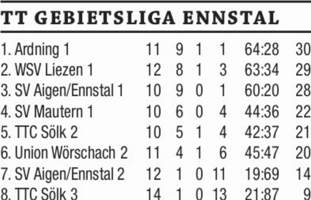 Im Spitzenspiel der Gebietsliga Ennstal feierte SV Aigen gegen Tabellenführer WSV Liezen einen 6:3-Auswärtssieg. Bei den siegreichen Gästen zeigte sich Jürgen Roth mit drei Siegen ohne Satzverlust in bestechender Form. Bernd Arrer gewann zwei Partien und im Doppel behielt das Duo Jürgen Roth/Bernd Arrer die Oberhand. Bei den unterlegenen Werkssportlern gingen zwei Zähler auf das Konto von Vladimir Galis und einmal war Andreas Winkler erfolgreich. Durch die Pleite der Liezener übernahm Ardning mit einem 6:1-Heimerfolg gegen SV Aigen 2 den Platz an der Sonne. Christian Dechler sowie Martin Stabentheiner trugen sich je zweimal in die Siegerliste und triumphierten auch im Doppel. Für den sechsten Punkt sorgte Markus Thalhammer. Den Ehrenpunkt für die Gäste holte Fabian Roth. Im Duell der Tabellennachbarn setzte sich TTC Sölk 2 auswärts gegen Union Wörschach 2 mit 6:3 durch. Gro- ßen Anteil am Erfolg der Gäste hatte Maximilian Kerschbaumer mit drei Erfolgen. Hannes Reiter punktete zweimal und das Doppel entschieden letztere zwei Athleten ebenfalls für sich. Bei den Hausherren verbuchte Ewald Scheucher zwei Punkte und Johann Huber brachte einen Zähler ins Trockene. Mit dem fünften Saisonsieg überholte TTC Sölk 2 das Wörschacher Zweierteam in der Tabelle.