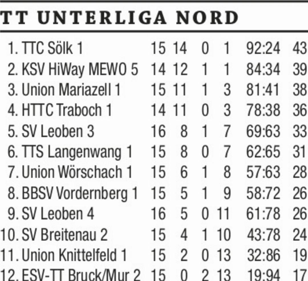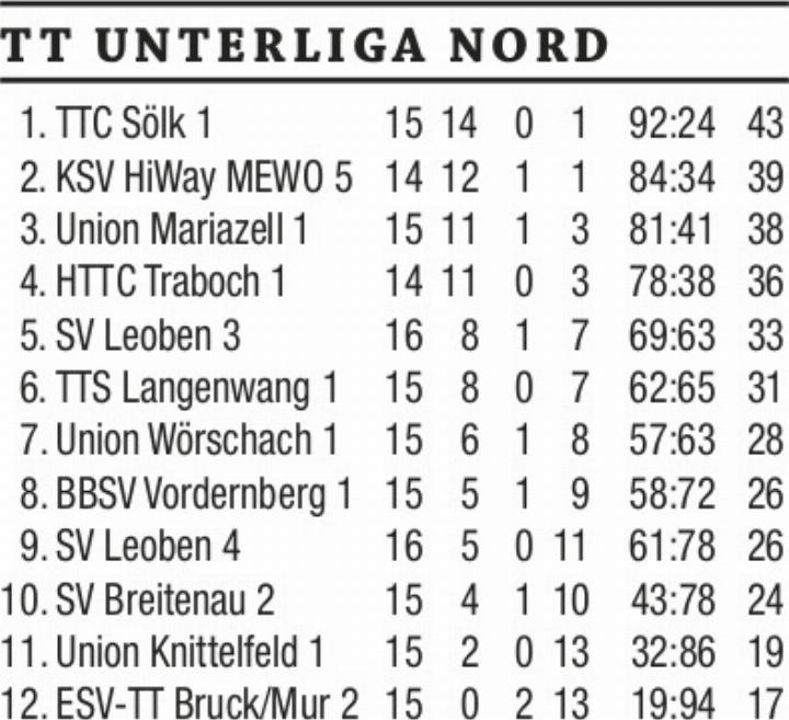 Unterliga-Nord-Tabellenführer TTC Sölk bezwingt ohne Probleme Bruck an der Mur. Erste Frühjahrsniederlage für Union Wörschach. Führungswechsel in der Gebietsliga Ennstal. Leader WSV Liezen muss gegen SV Aigen Federn lassen.